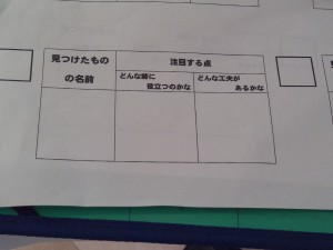 子ども達の記録用紙です。見つけたものの名前、注目する点(どんなときに役立つか、どんな工夫があるか)を記入できるようになっていました。