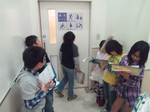 トイレの中の工夫を探しにいった子ども達は、ドアのイラスト(ピクトグラム)にも注目していました。私からは、もし自分たちが外国で買い物をしたとき、日本語ではなくフランス語しか書いてなかったらどうする?といった投げかけをしました。