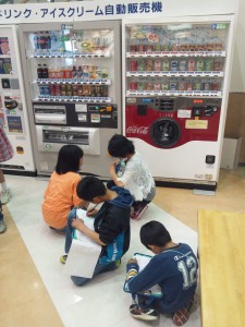 お店の中の自動販売機に注目した子ども達の様子です。右側と左側の自動販売機を見比べながら、左側の自動販売機の工夫について探していました。