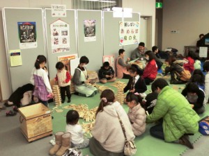 2階も様々なイベントを開催しましたが、子どもの遊び場では、NPO法人子どもと文化の森のカプラ(積木)あそびが大盛況でした。