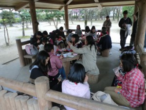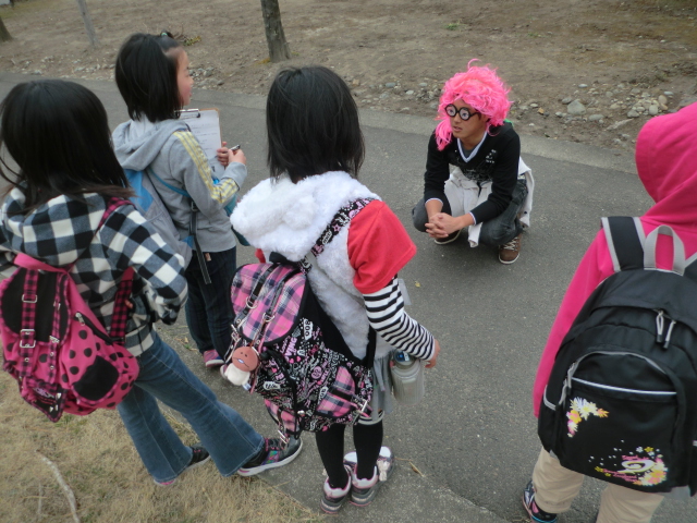 今日は9時~15時といつもより長い時間を使っての内容でした。江南レクリエーション・キャンプカウンセラー協会(KRCCA・クラッカ)のメンバーの協力で、市内のウォークラリーを通じて、自分の町の人と交流し、「ふだんのくらしのしあわせ」を考えようというテーマで行いました。