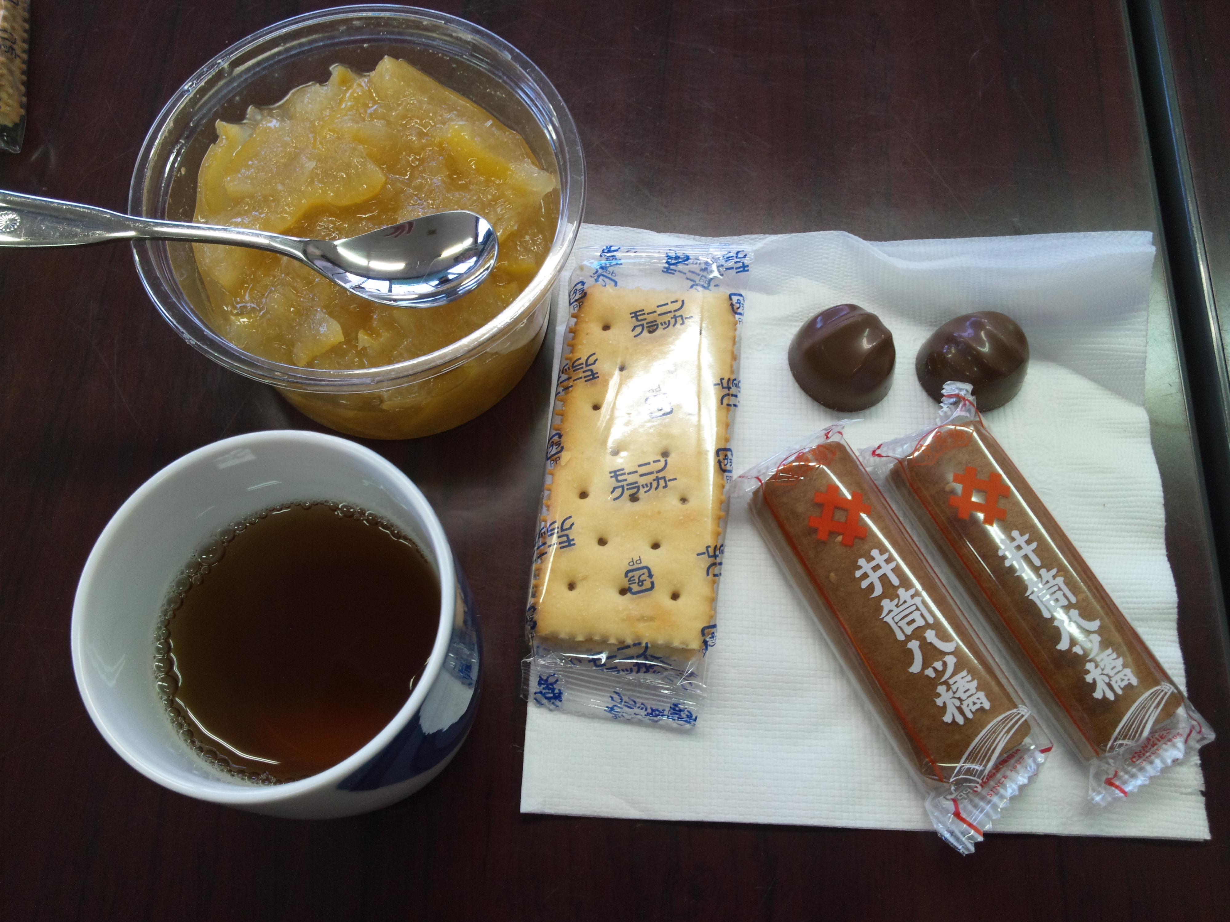 今日もボランティア相談員の方々より、美味しいお菓子とお茶をいただきました。マーマレードとクラッカの組み合わせがとても美味しかったです。