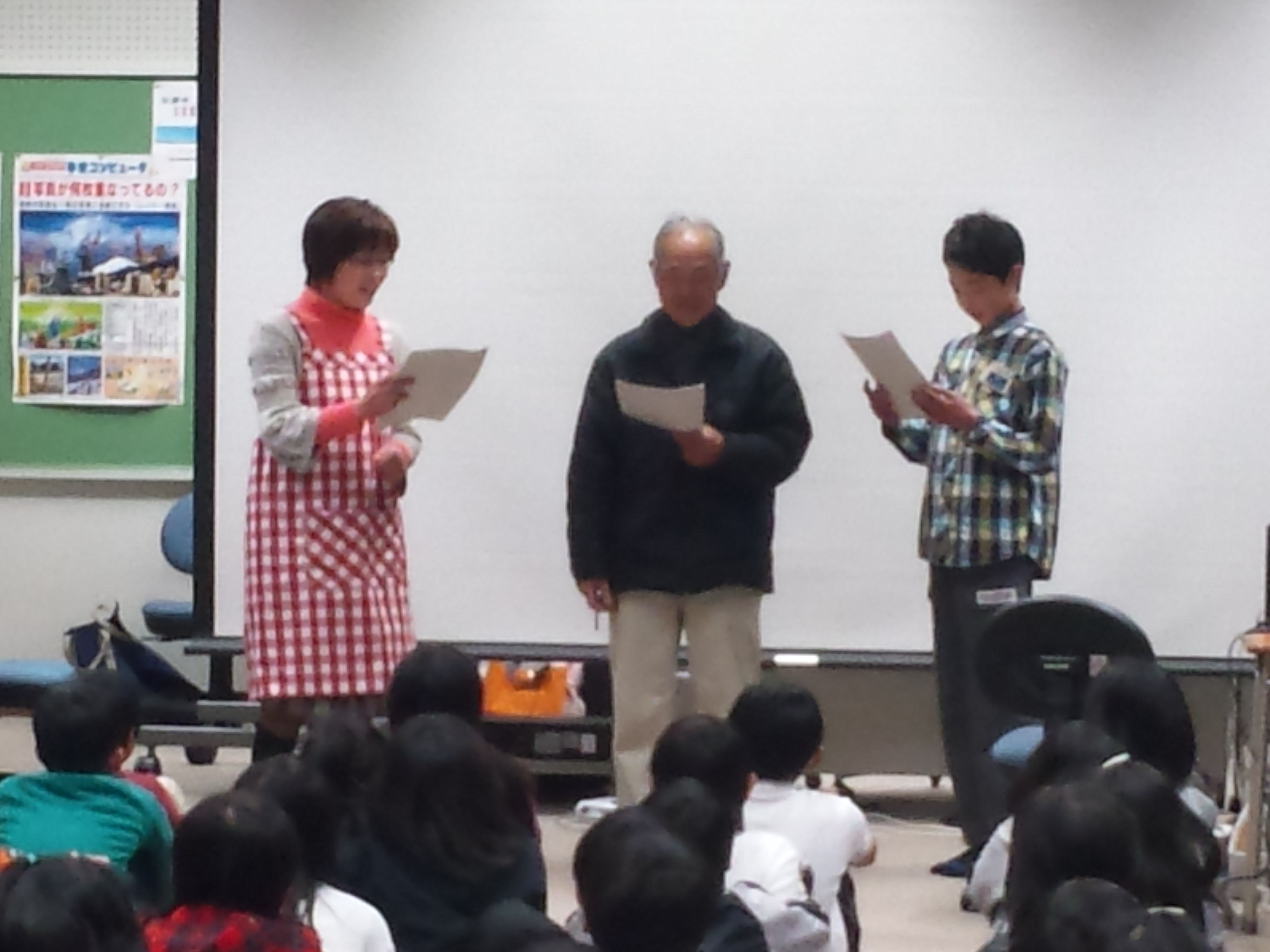 お話の後に、認知症の方への対応としてかんたんな劇を行いました。子ども達も孫役として参加し、「朝ごはんの巻」「洗濯の巻」「買い物の巻」「昼ごはんの料理の巻」の4つの劇を行いました。子ども達は台詞を感情を込めて演じてくれました。