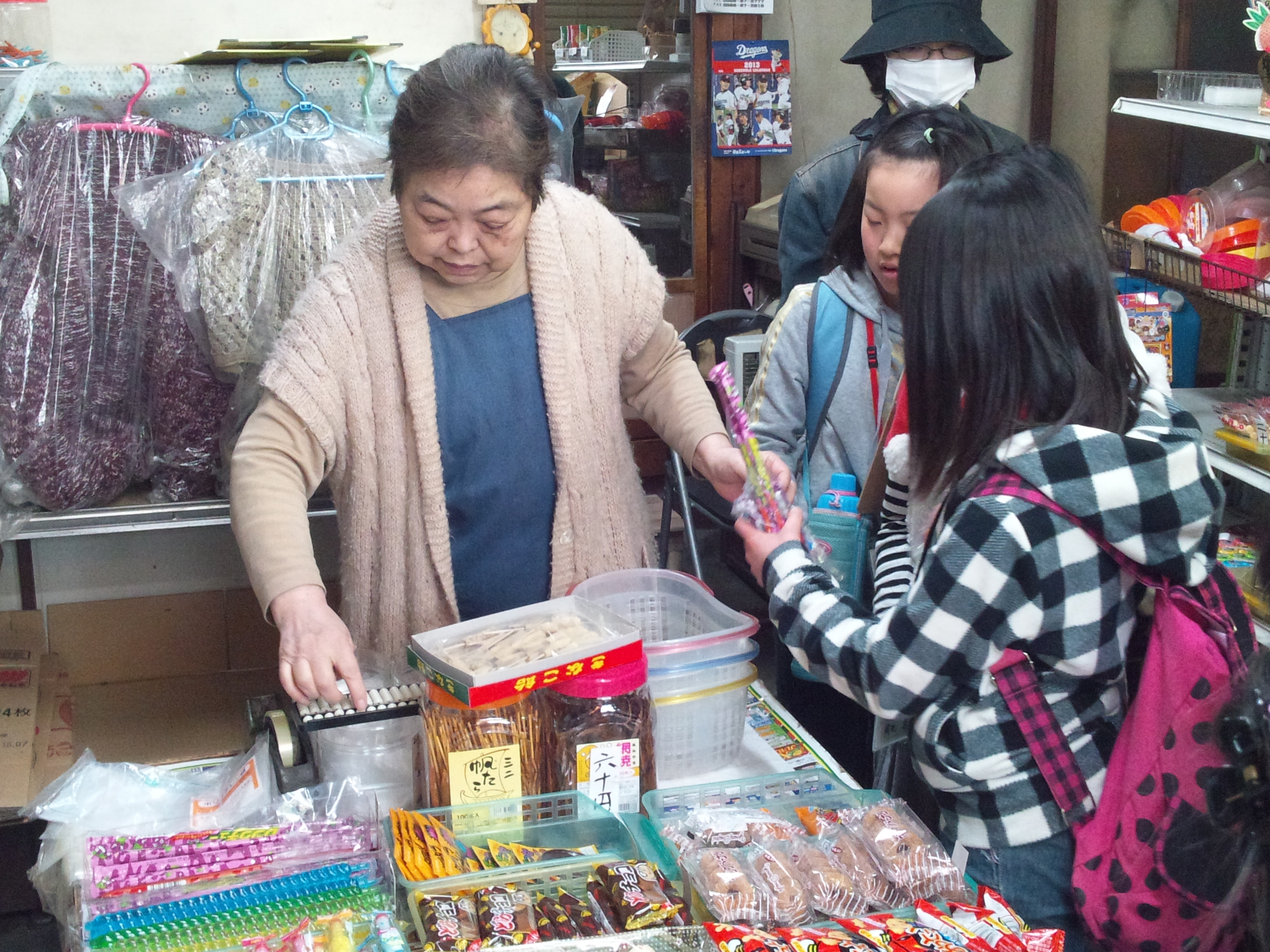 江南駅の駅東商店街へ移動し、駄菓子屋にお邪魔しました。子ども達は金額ぴったり駄菓子を買い、お店の方はそろばんで計算していました。