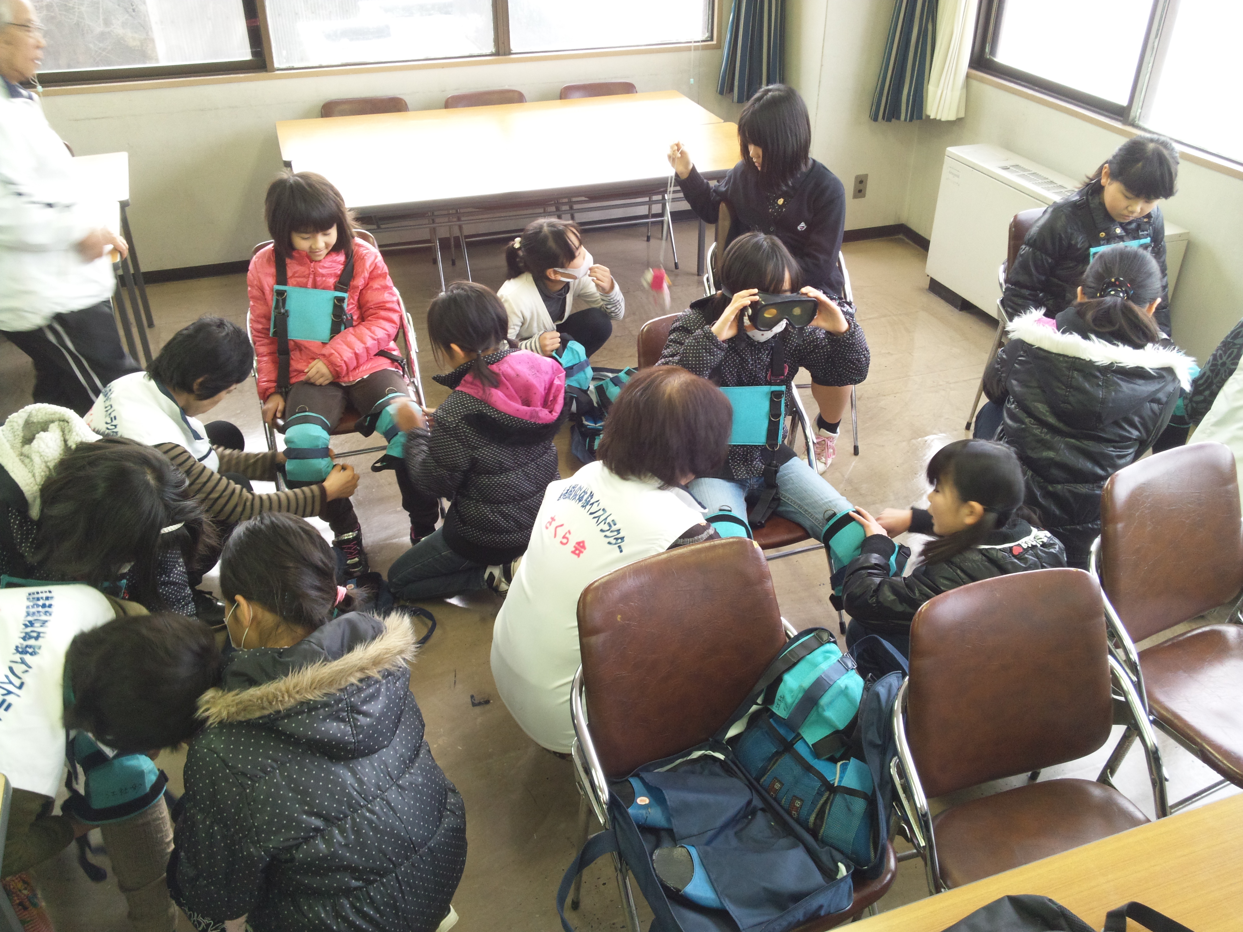 さくら会より、今日の内容についての説明後、高齢者疑似体験の装具を付けました。身体の動きに制限があったり、ゴーグルで視野が見にくくなりました。
