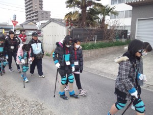 2月の子ども福祉塾は、高齢者疑似体験インストラクターグループさくら会の協力により、高齢者疑似体験を行いました。内容は装具をつけて、名鉄バスに乗り、江南団地の集会所へ行き、自動販売機でジュースを買う体験を行いました。