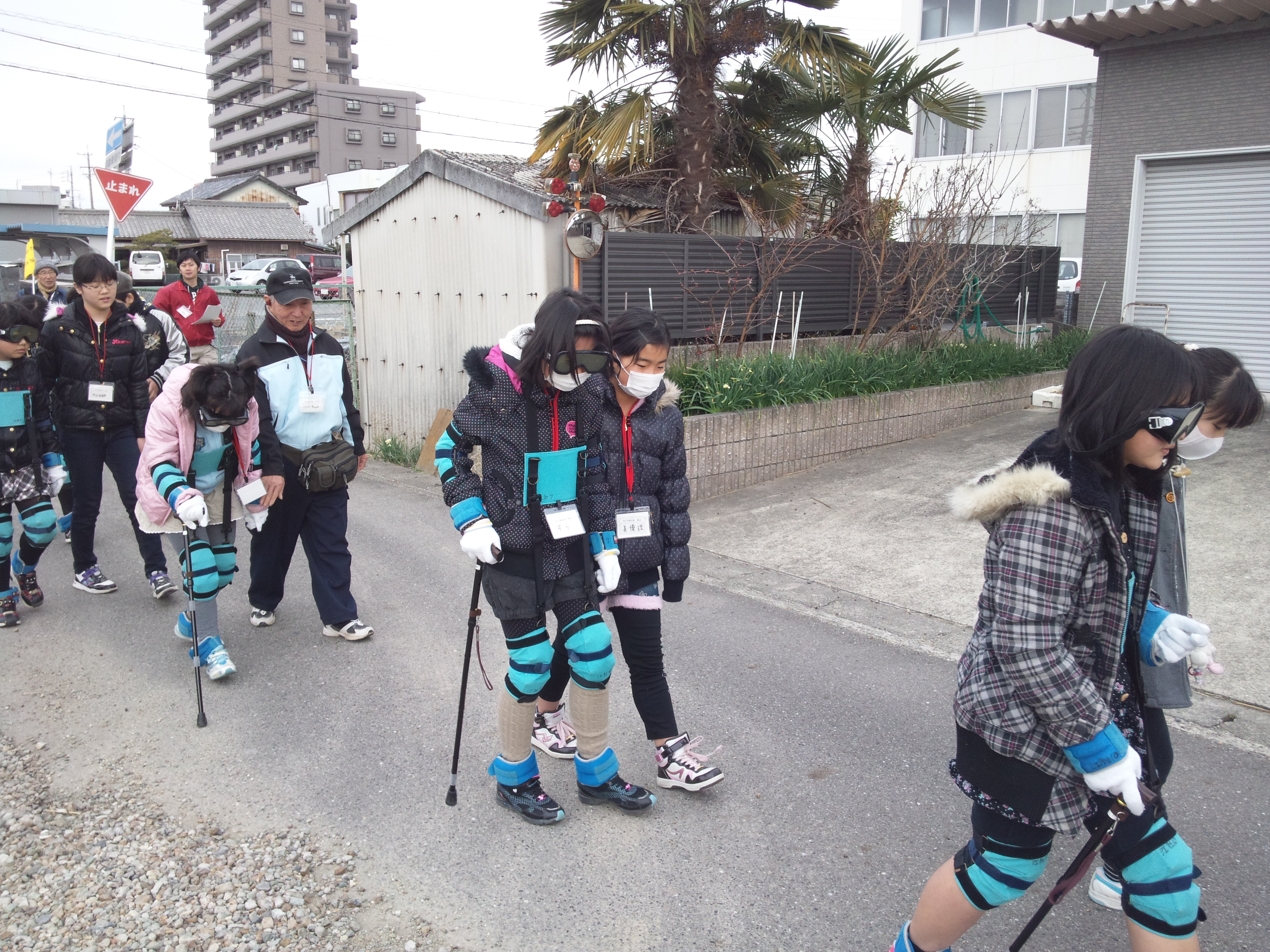 集会所で休憩し、ペアで介助していた子どもが装具をつけて帰り道で同じ体験を行いました。
