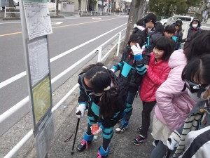 子ども達はペアになって、バス亭まで歩きました。介助する側も転ばないように気をつけていました。