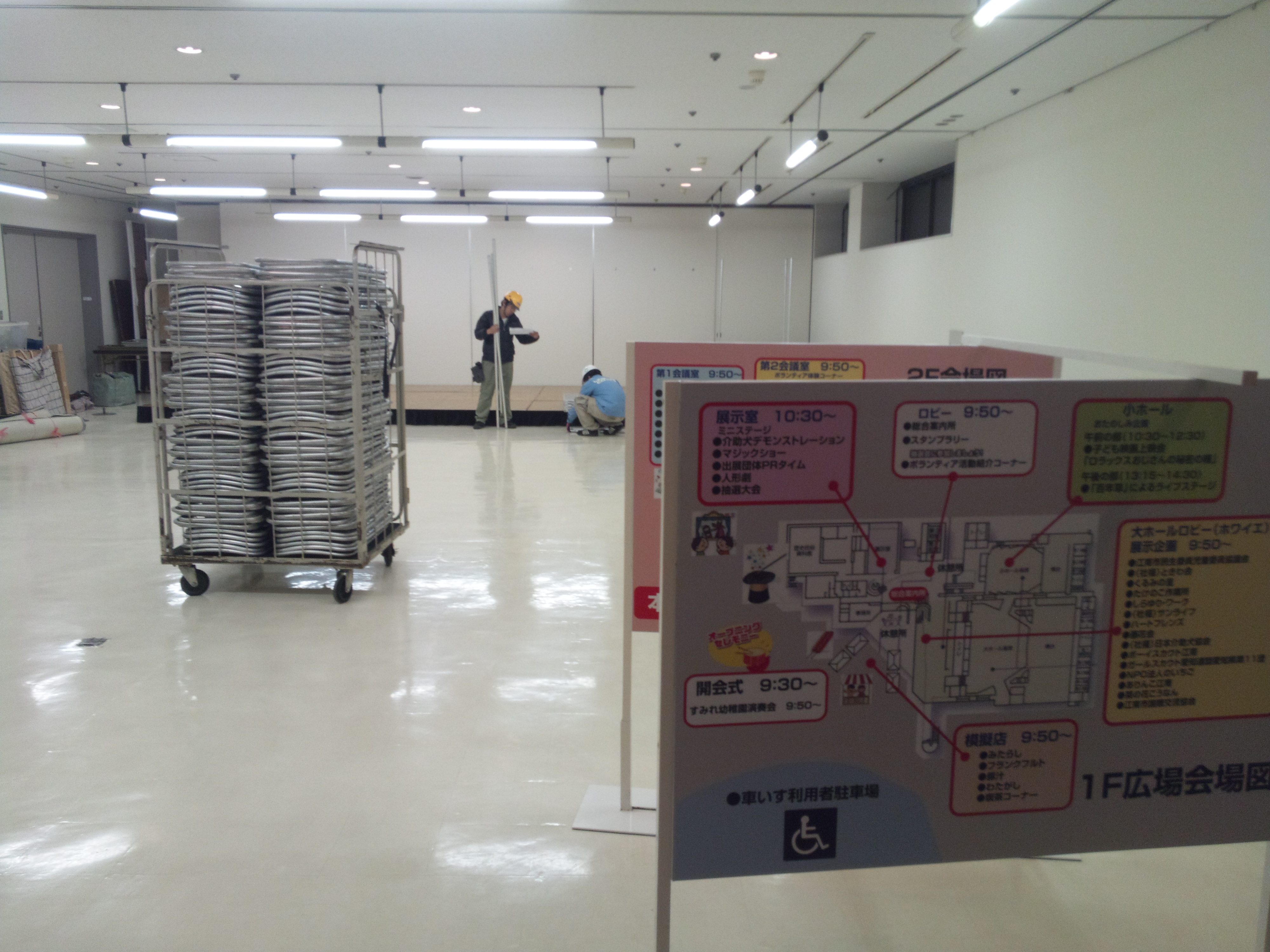 3月1日(金)の夕方より、3月3日(日)に江南市民文化会館で開催する「第4回ふくし江南ふれあいまつり」の会場設営を行いました。