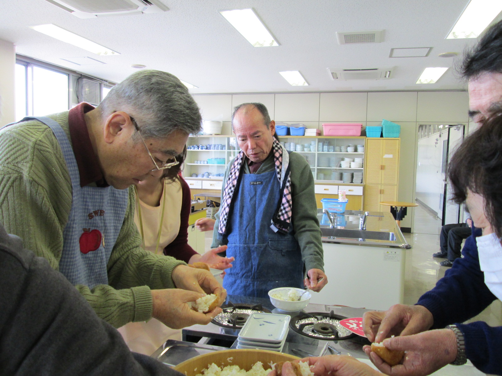 いなり寿司をにぎっている写真です。男性の方々も積極的に参加し、調理を行いました。「ボランティアグループあすなろ」も参加し料理作りをサポートしました。