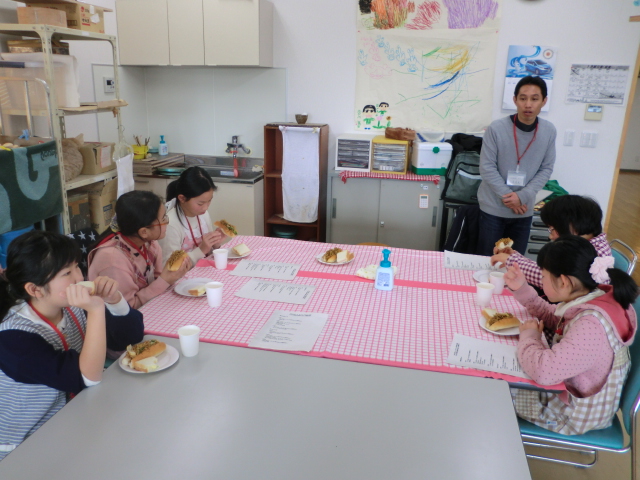 参加者の子ども達は4つのグループに分かれて、焼きそばロールとサンドイッチづくりの工程をグループ担当のたけのこ作業所職員と子ども福祉塾のスタッフと確認をしました。