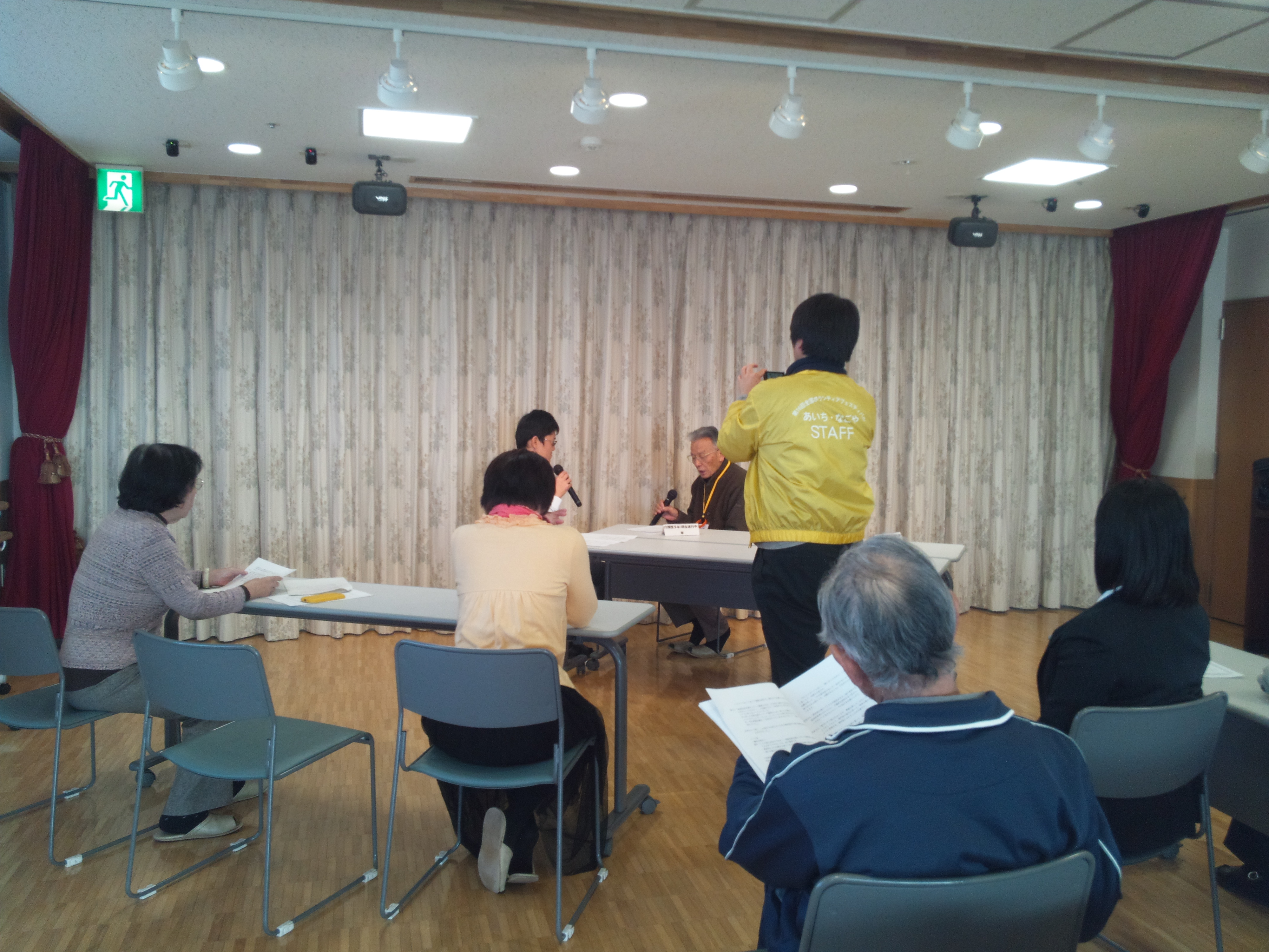 今日のメインである「家族の心理」のビデオ撮影です。サポーター講座では必ず「家族の心理」を受講者にお話するのですが、実際に介護している家族の方にインタビュー形式で撮影し、DVDにして生の声を届けようという試みです。今日は映画監督がたくさんいて、「照明の明るい所で!」「もっと近づいて!」と和やかな雰囲気で撮影できました。私はカメラマンです(笑)。