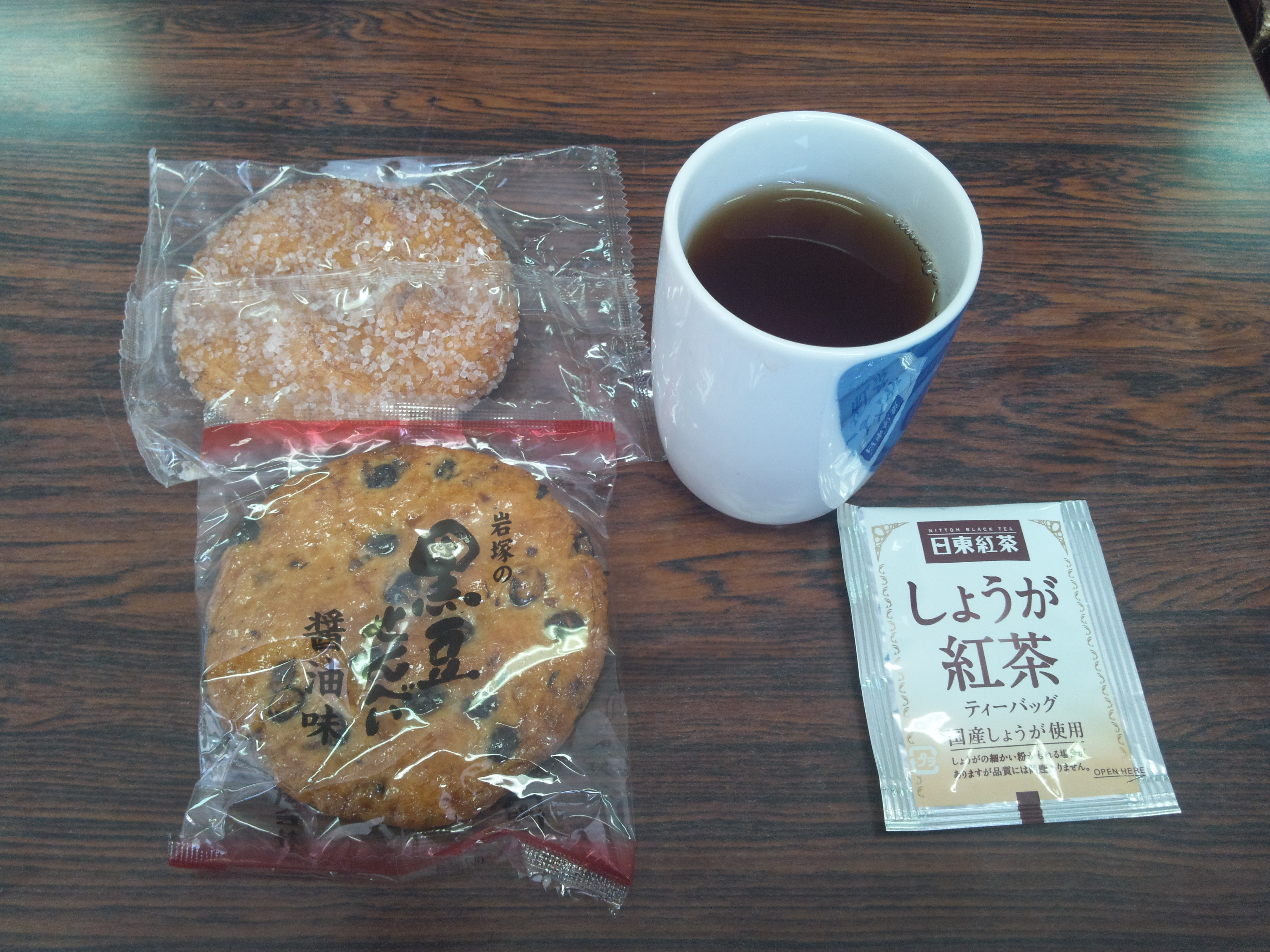 今日もボランティア相談員さんより差し入れをいただきました。おせんべいも美味しくいただきました。何より初めて「しょうが紅茶」をいただきました。しょうが風味で香りも楽しみつつ、紅茶で一息つくことができました。