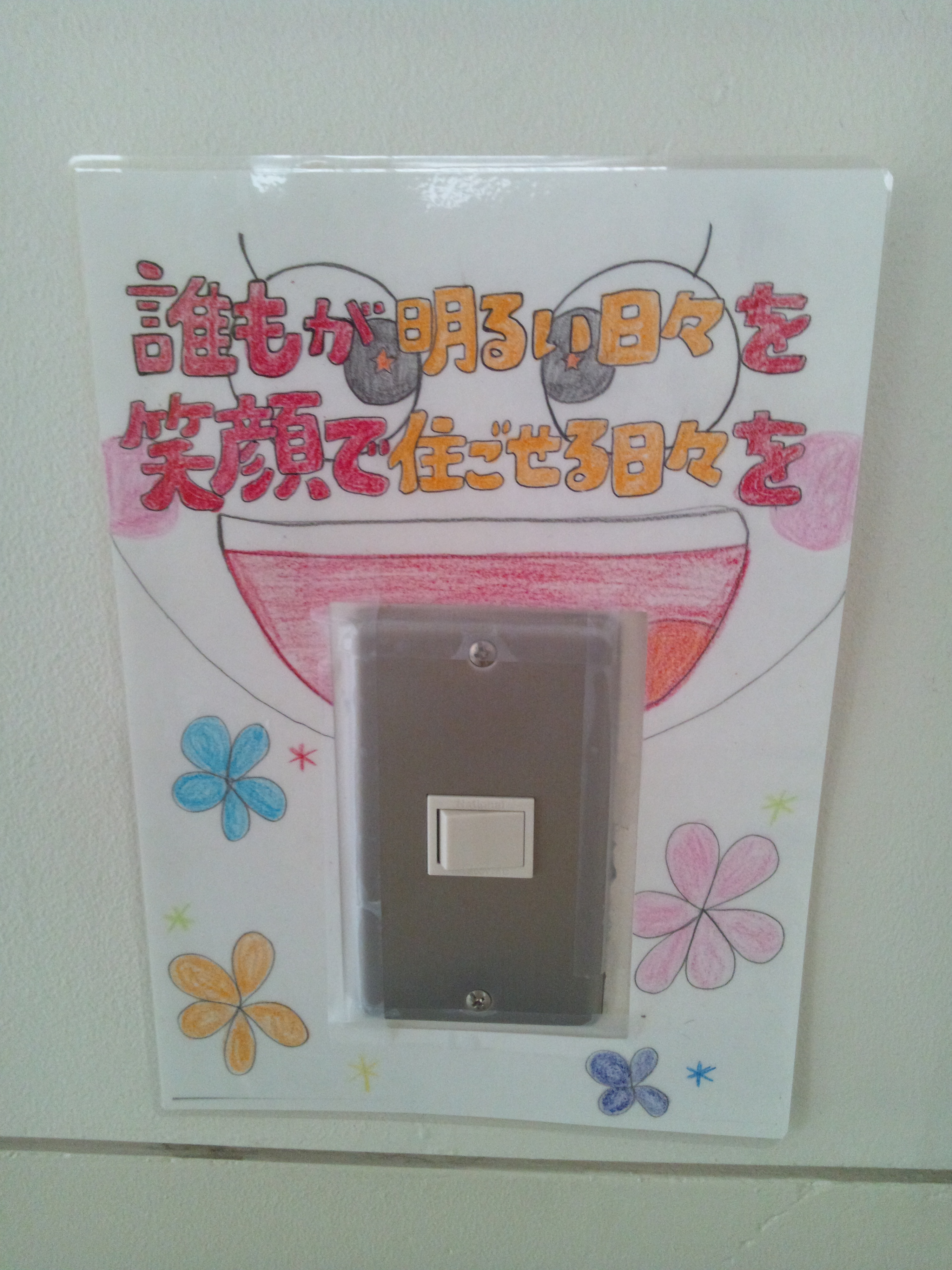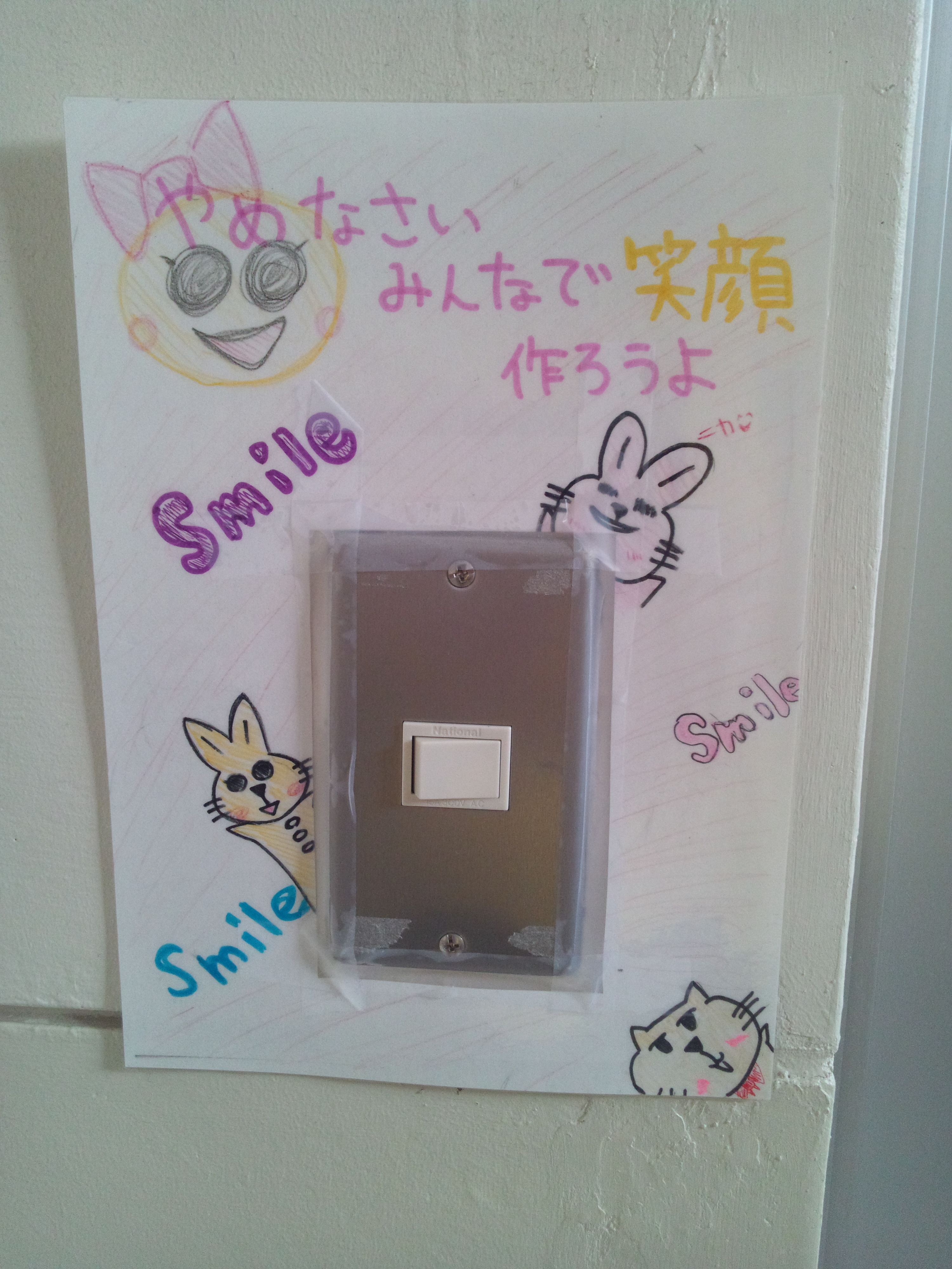 先生に伺ったところ、東日本大震災後、節電のため小まめに蛍光灯のスイッチを切る機会が多くなったので、生徒会活動の一環としてメッセージ付きのカバーとして貼ったのだそうです。
