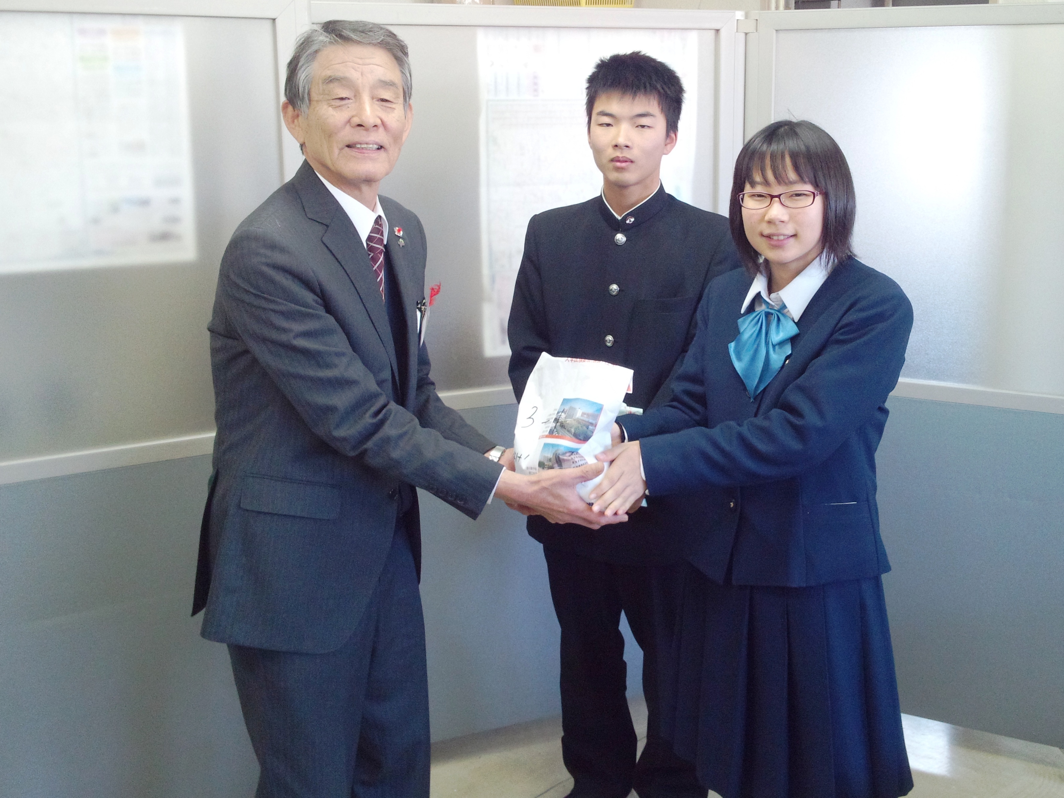 生徒会の会長・副会長より事務局長へ募金をお渡しいただいたときの写真です。生徒みなさんのお気持ちがとても嬉しく思いました。福祉のために募金を活用させていただきます。