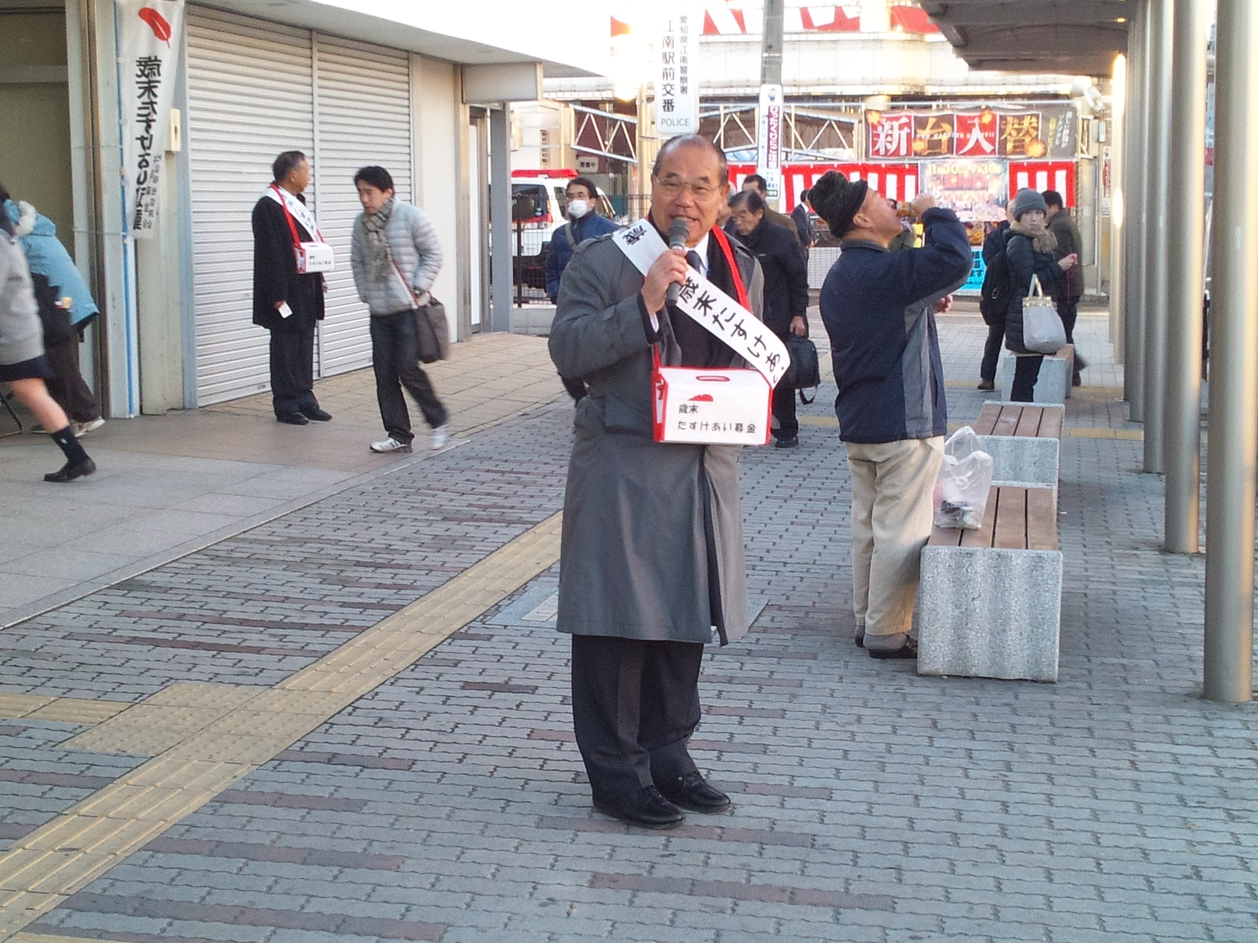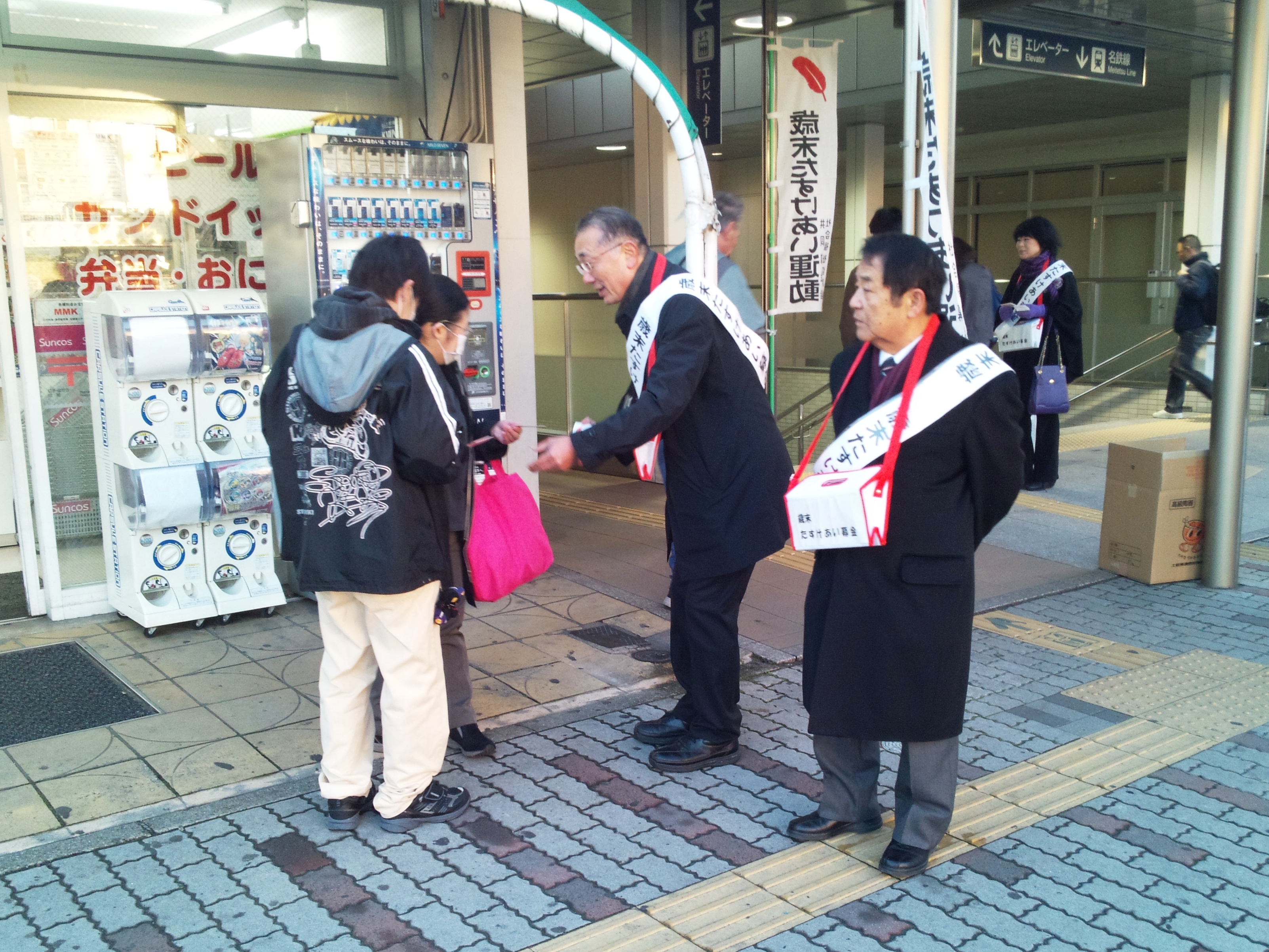 江南市長の堀元さまにも、早朝より街頭募金にご協力をいただきました。江南駅での活動後に、布袋駅に移動し、街頭募金を行ってくださいました。