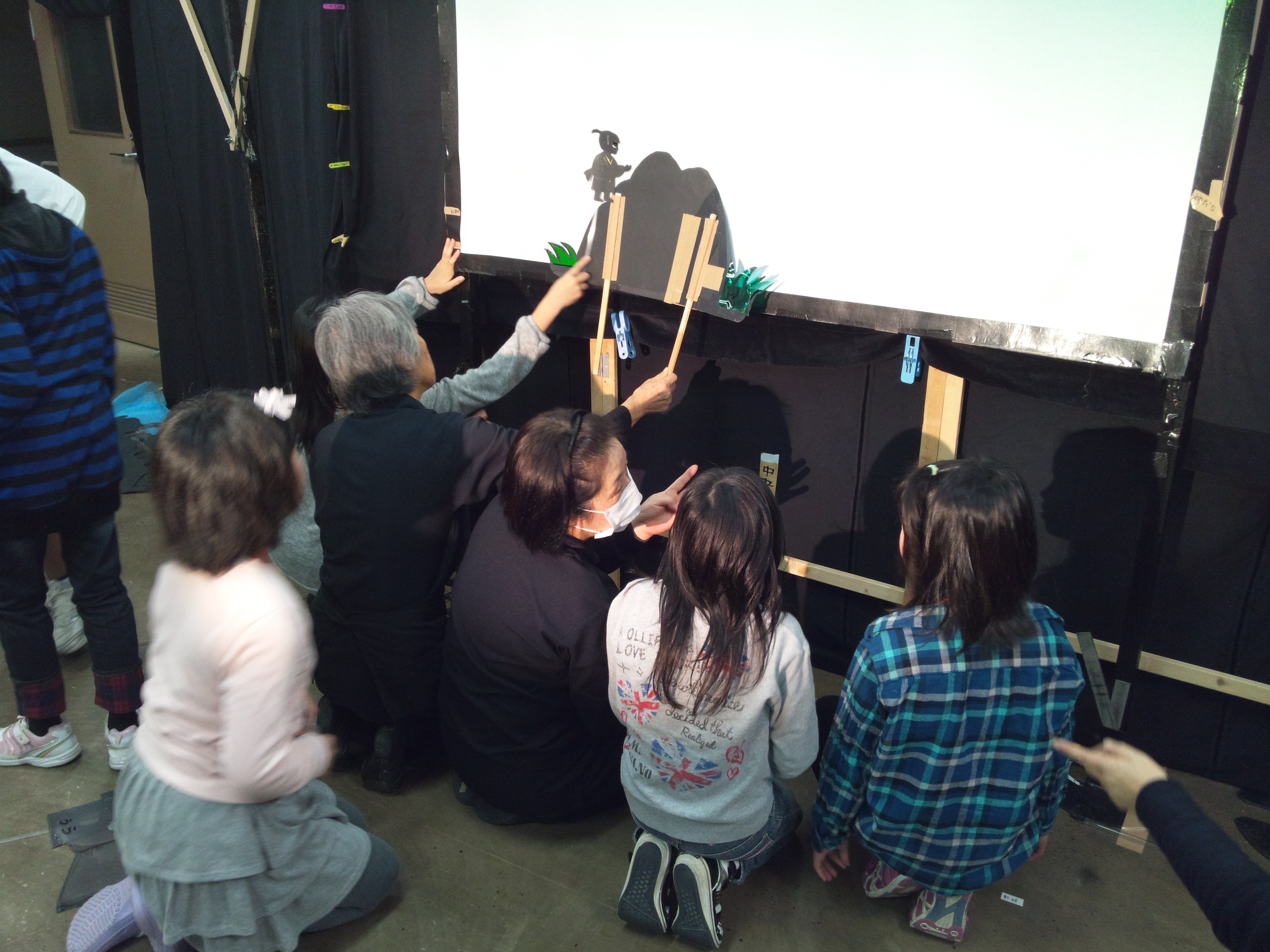 今月は登録ボランティアグループの人形劇わらしべの協力で、子ども達に実際に、舞台の組み立てから、影絵の練習、家族への公演、後片付け、全てを行いました。