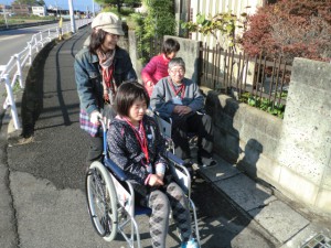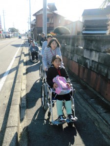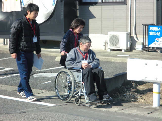 今日の活動は、車いすに乗る人と介助する人とペアになって、実際に道路で移動し、バス亭から名鉄バスに乗って、コンビニで買い物をして、くるみの里へ戻ってくる内容でした。