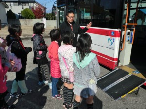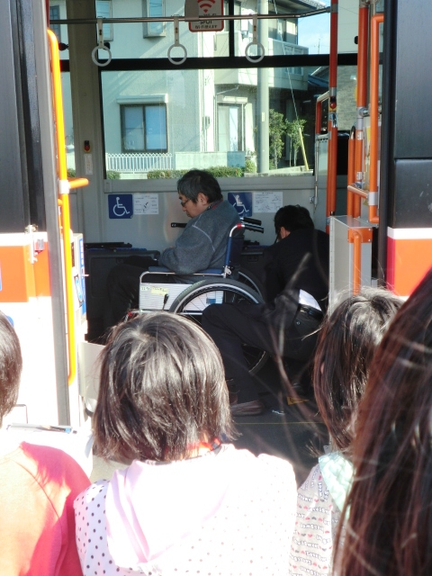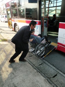 バスの運転手さんが実際にお客さんとして対応する場面です。スロープがバスの中から出して介助しました。