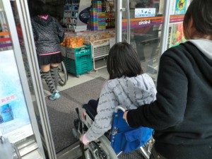車いすの乗りながら、コンビニで買い物を体験しました。棚の高さによって、買いたい商品が届かないといったことに気づきました。