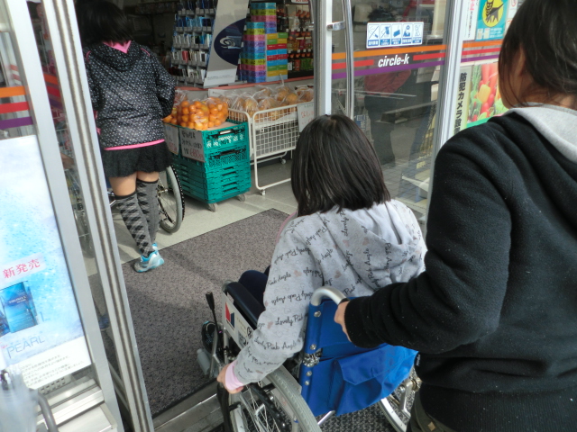 実際にバスに乗って目的地のバス亭(尾関)へ到着後、コンビニまで移動しましたが、側溝のつなぎ目の溝にタイヤが挟まったり、車いす生活のしづらさに気づきました。