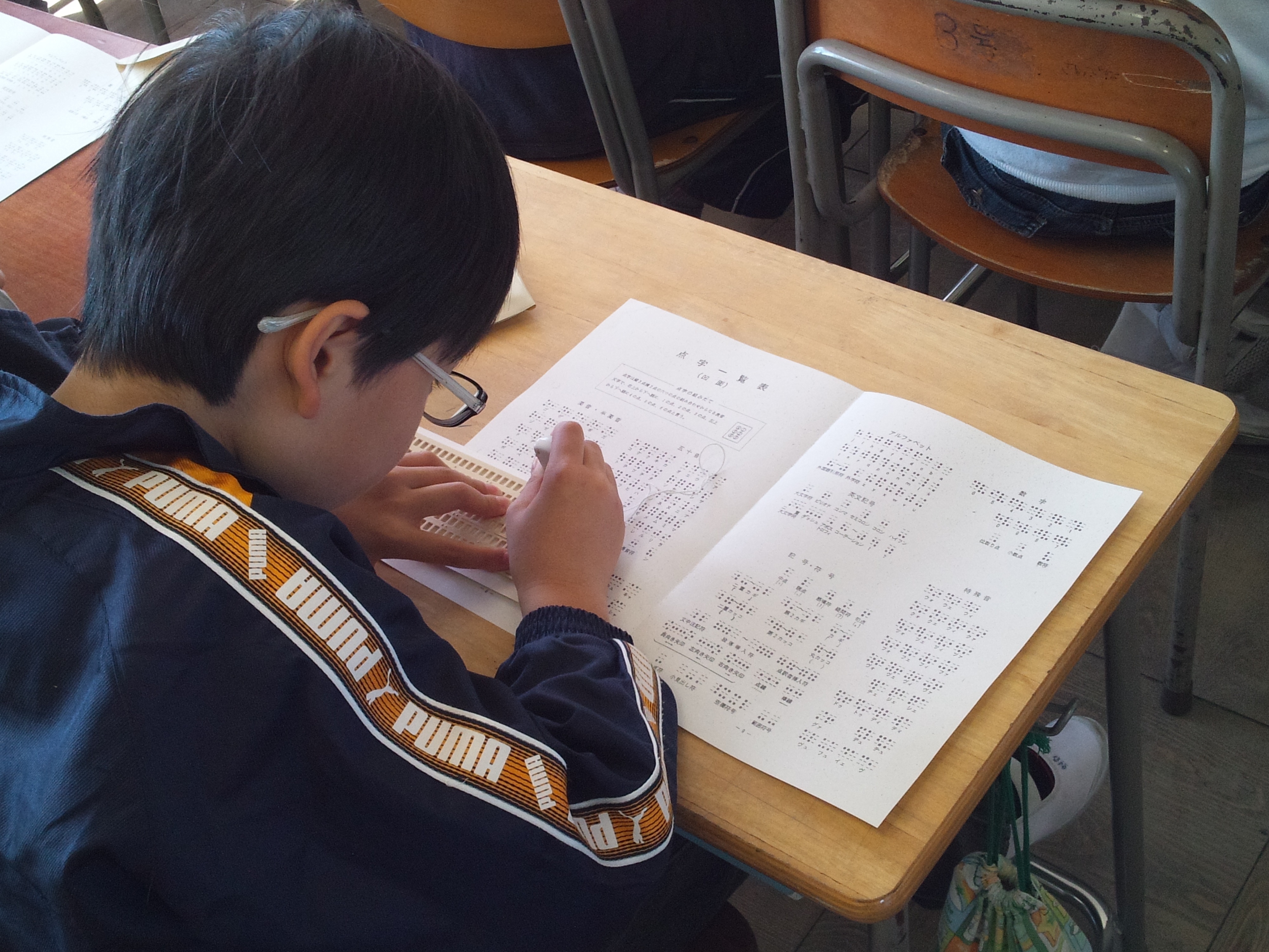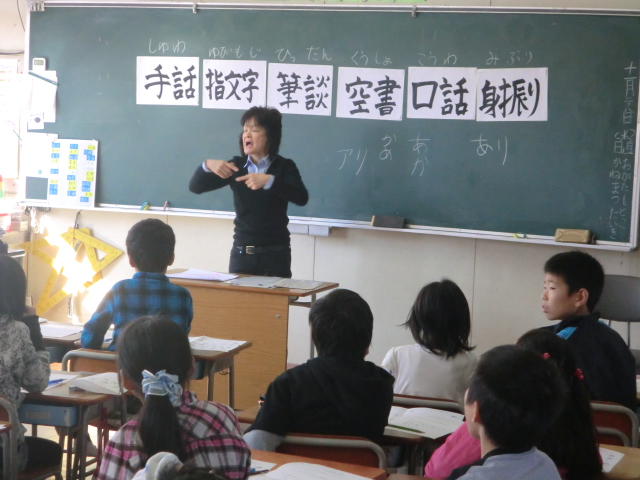全体講義終了後、3年生は手話教室、4年生は視覚障がい者ガイド教室、5年生は点字教室、6年生は高齢者疑似体験教室を行いました。