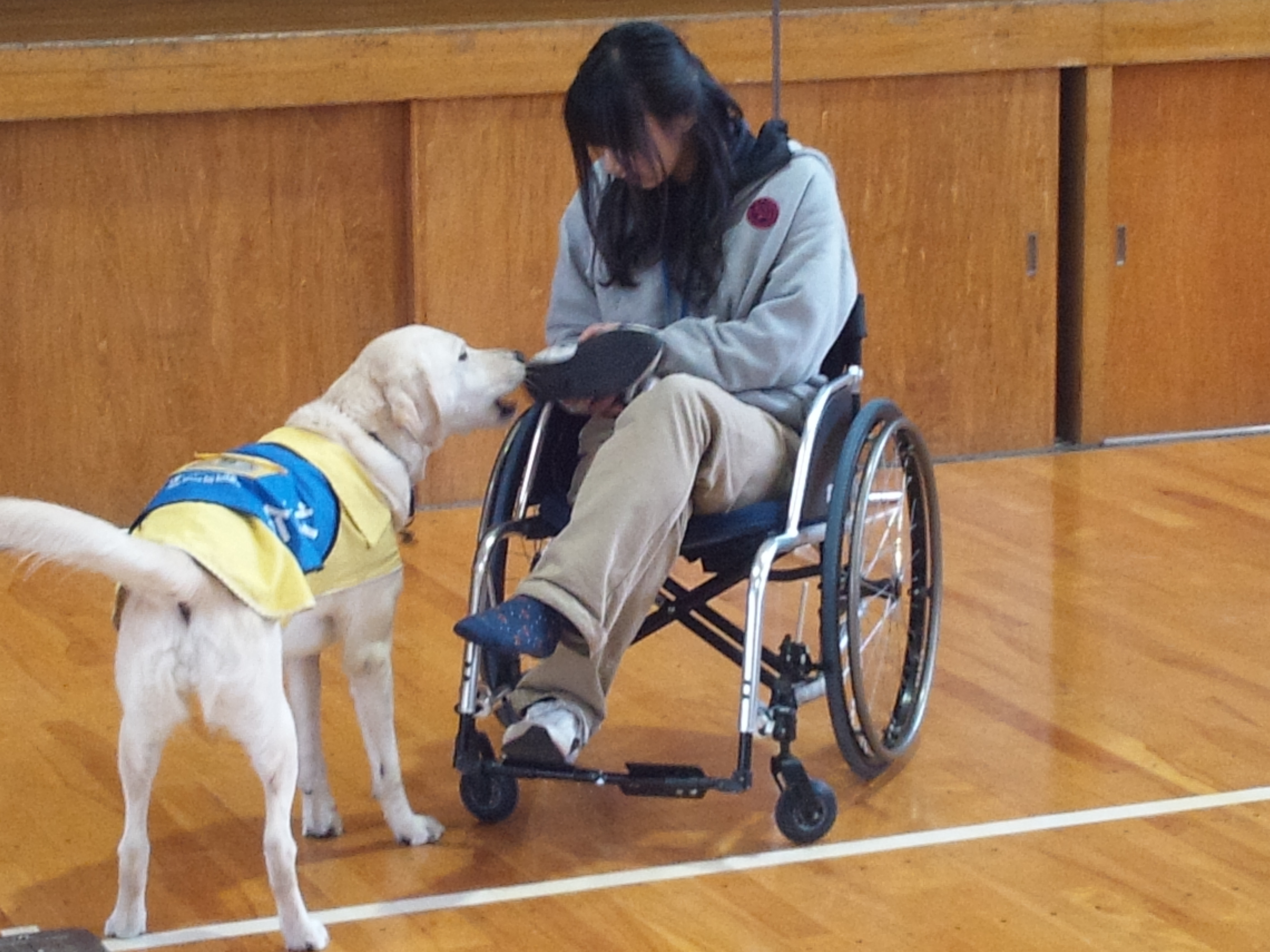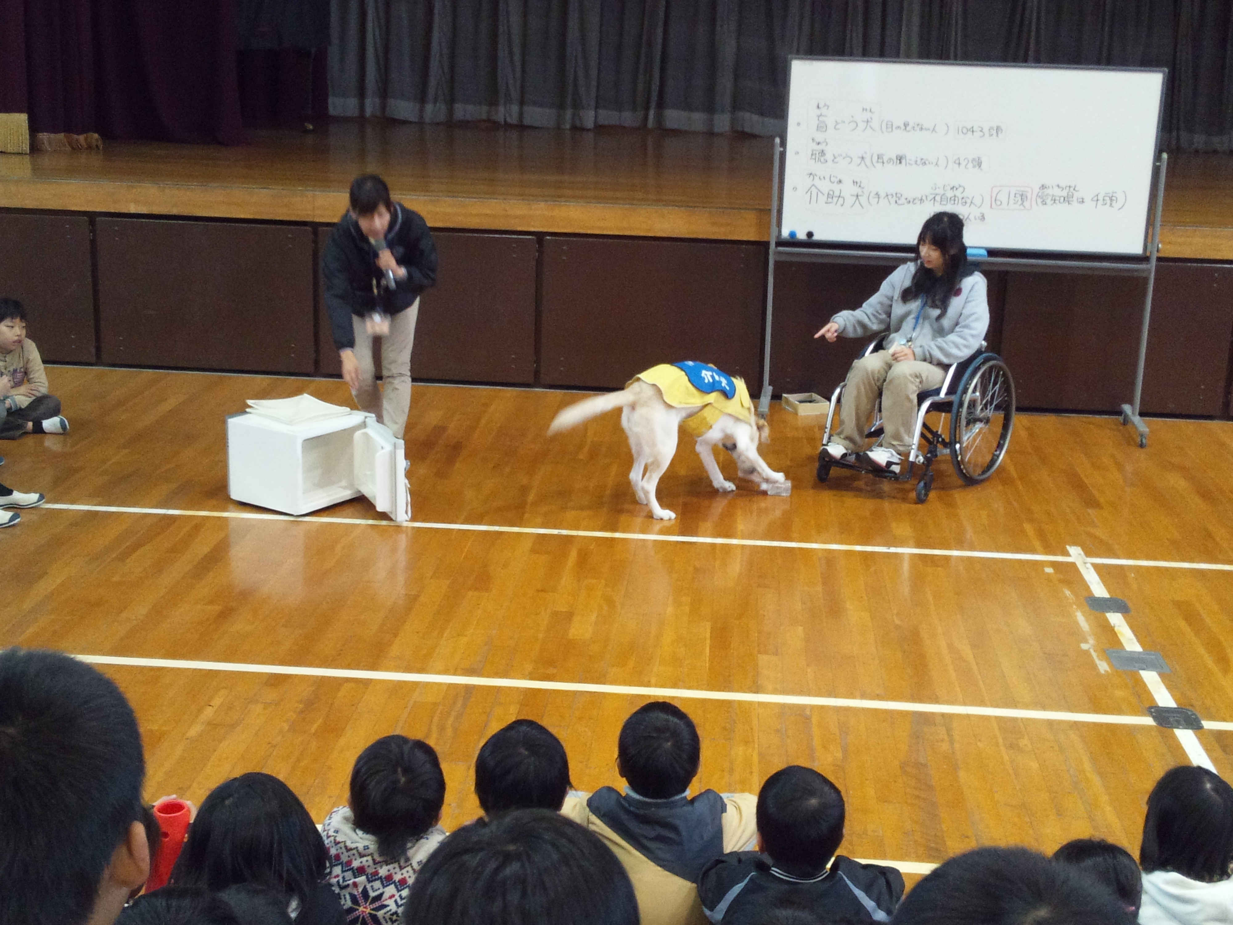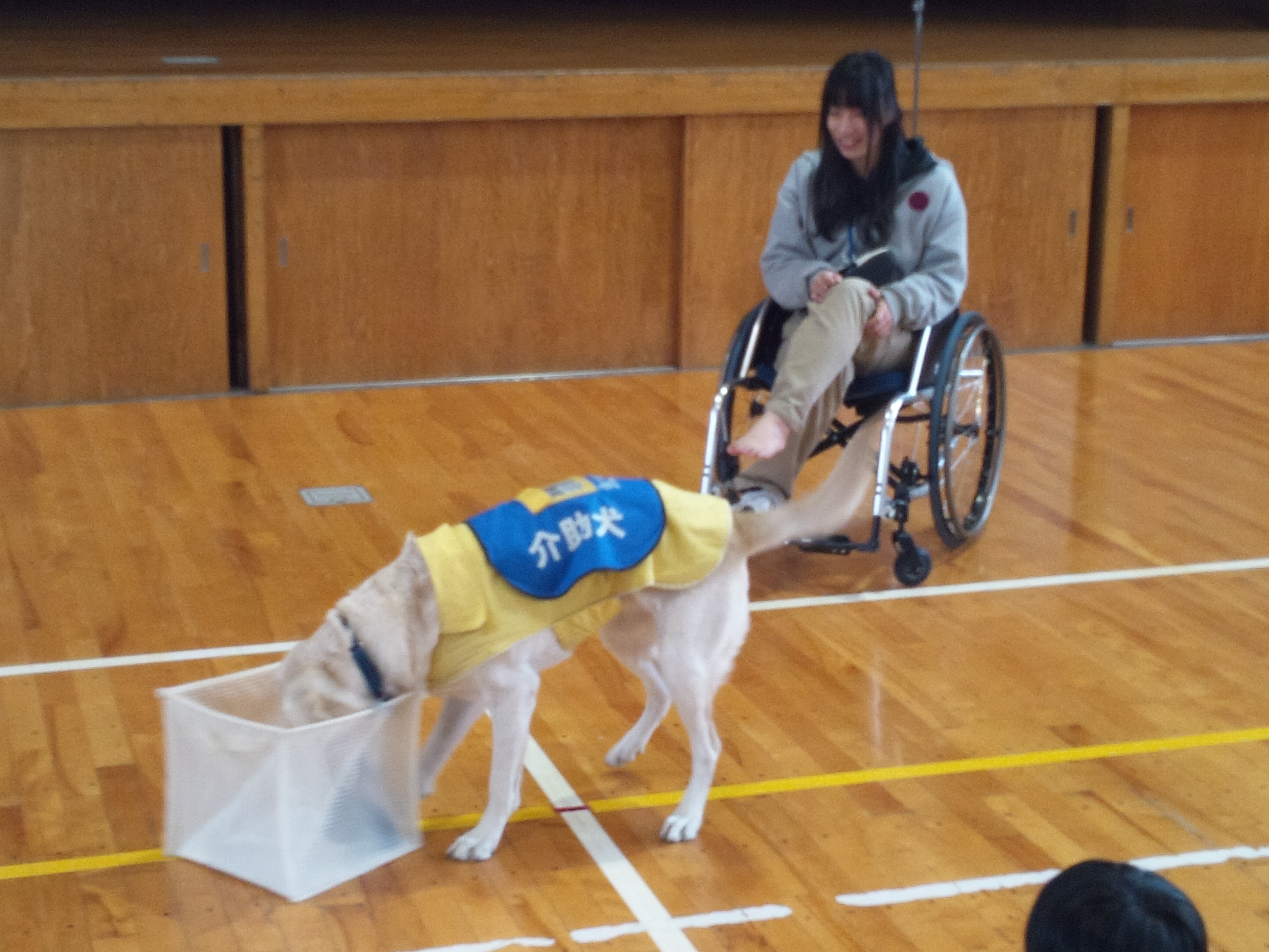 最初に身体障害者補助犬(盲導犬・聴導犬・介助犬)のお話をした後、実際に介助犬のデモンストレーションを行いました。靴を脱がし、靴下を脱がせ、洗濯かごに入れるといった内容を見せてくれました。
