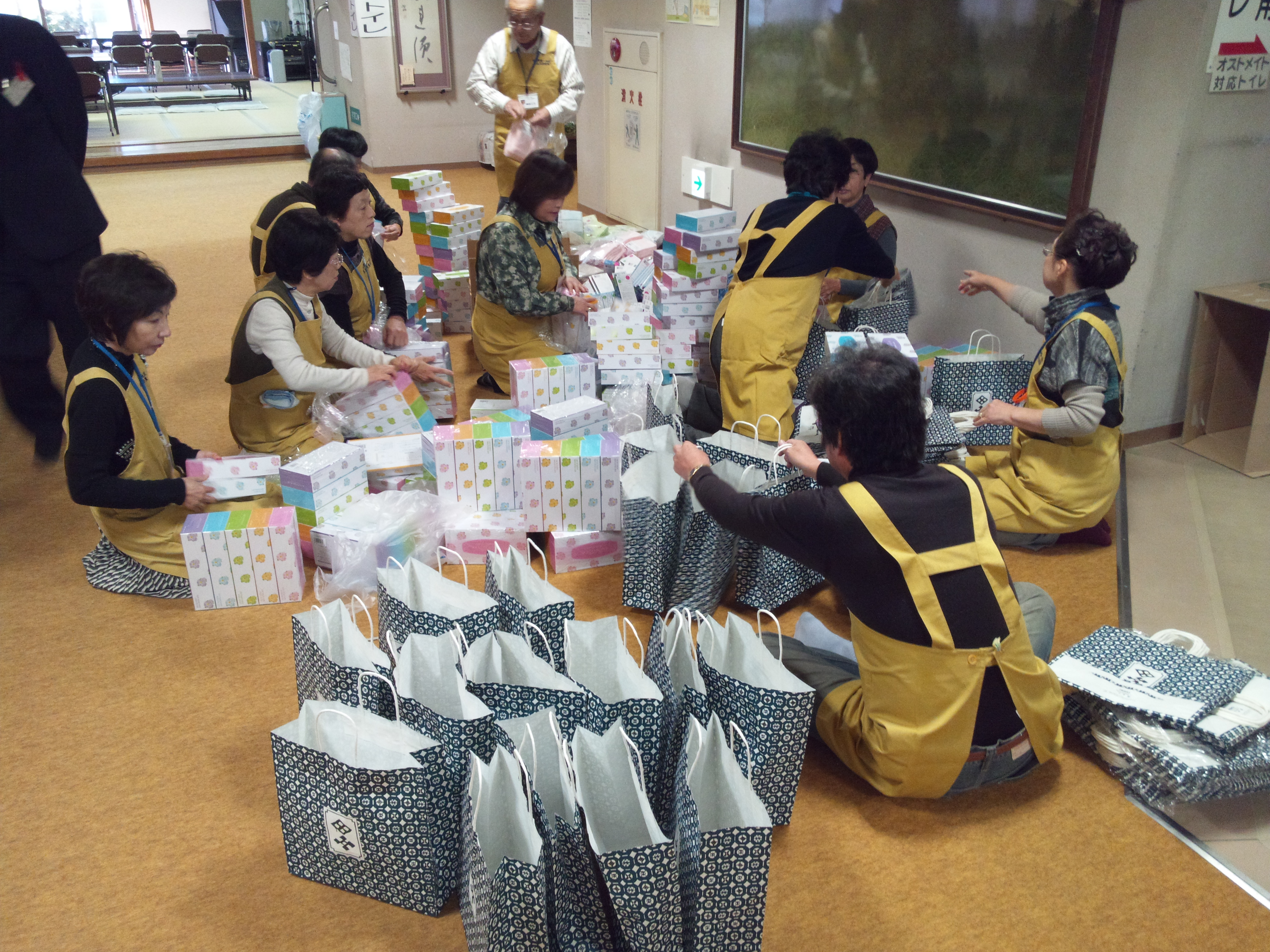 朝早くから民生委員、主任児童委員の方々にご協力をいただき、土産の荷造りから始まりました。食事会のために作成したエプロンを着て、作業を手早く進めていただきました。