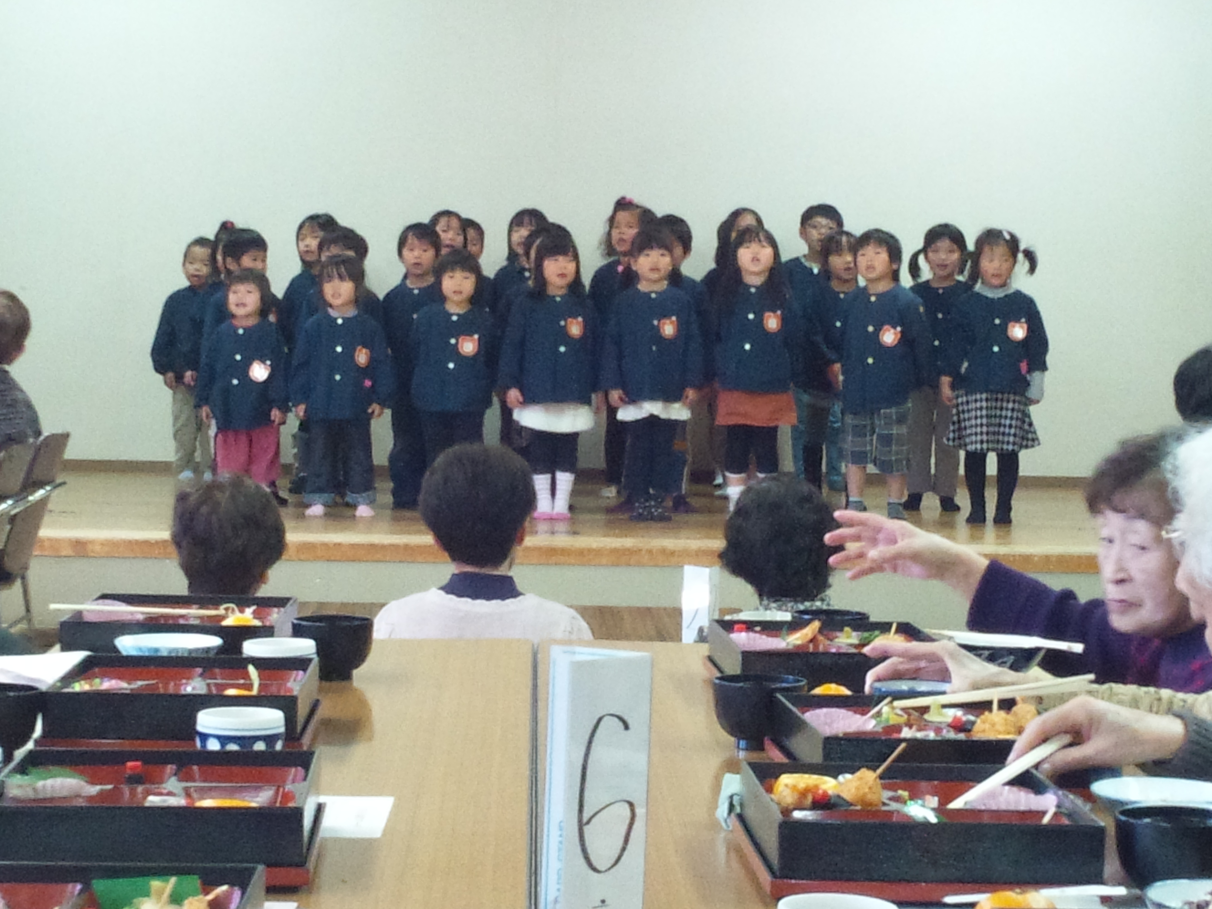 最後に、11月16日(金)に実施した高齢者ふれあい食事会にて、古知野中保育園の園児にお越しいただきましたが、舞台で歌をうたっている写真を民生委員さんから預かりました。