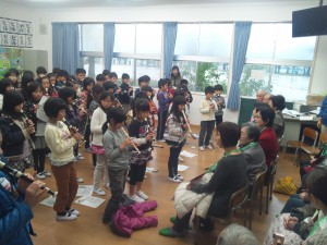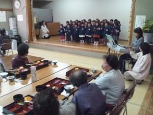 子ども達より、リコーダーの演奏をしてくれました。演奏曲は「春の小川」、そして今日のために「みかんの花咲く丘」を練習してくれて、発表してくれました。