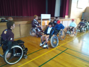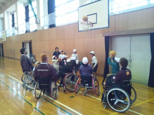 選手の方々より自己紹介をしていただいた後に、車いすバスケのルール等を教えていただきました。基本的には通常のバスケットボールと同じですが、ダブルドリブル(ファール)がなかったり、選手の障害程度によって持ち点(1点~5点)があって、コート上には5人で14点までという特別ルールがあることを教えてくれました。