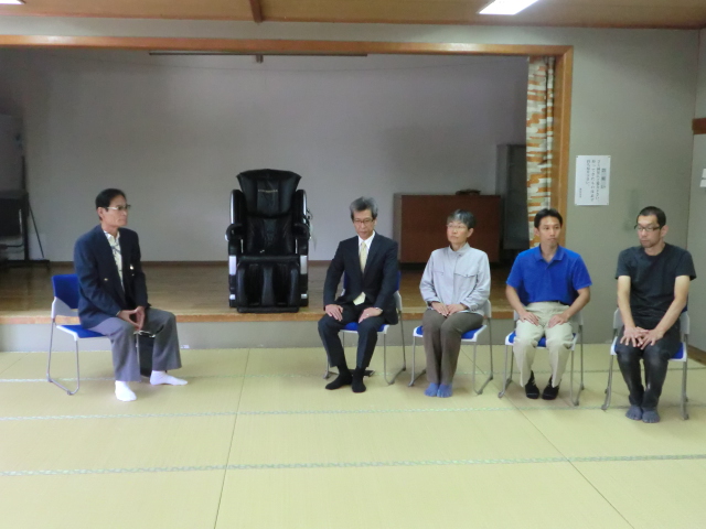 1階の大広間を案内している様子です。老人クラブの方が毎日使用していることや、災害時には避難所として使用されていることを説明しました。