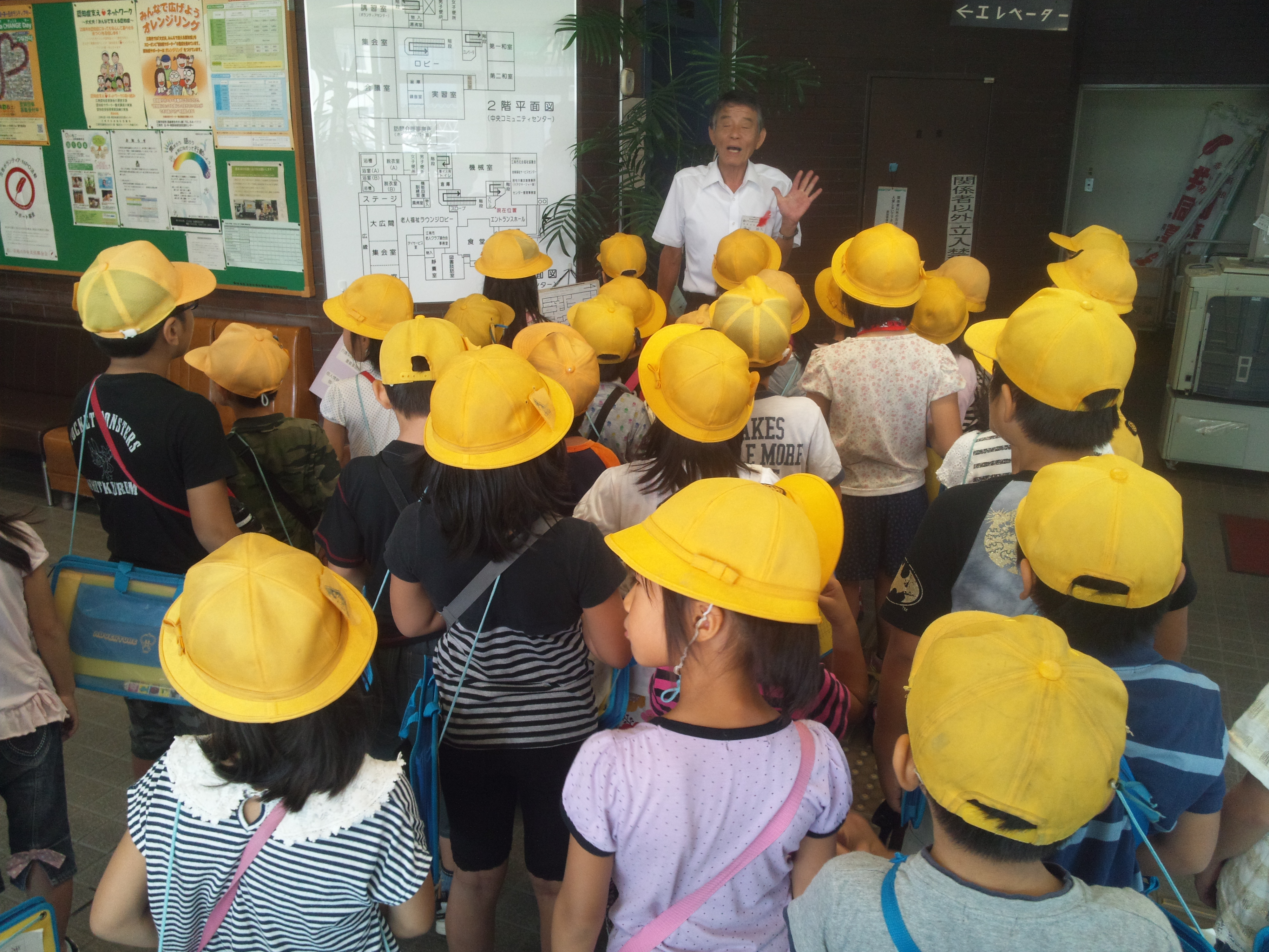 2階へ上がり、老人福祉センターの施設内の工夫について、子ども達が気づいたことを質問しました。階段が緩やかになっていたり、手すりがあったり、いろんな方が利用しやすいように工夫されていることを説明しました。
