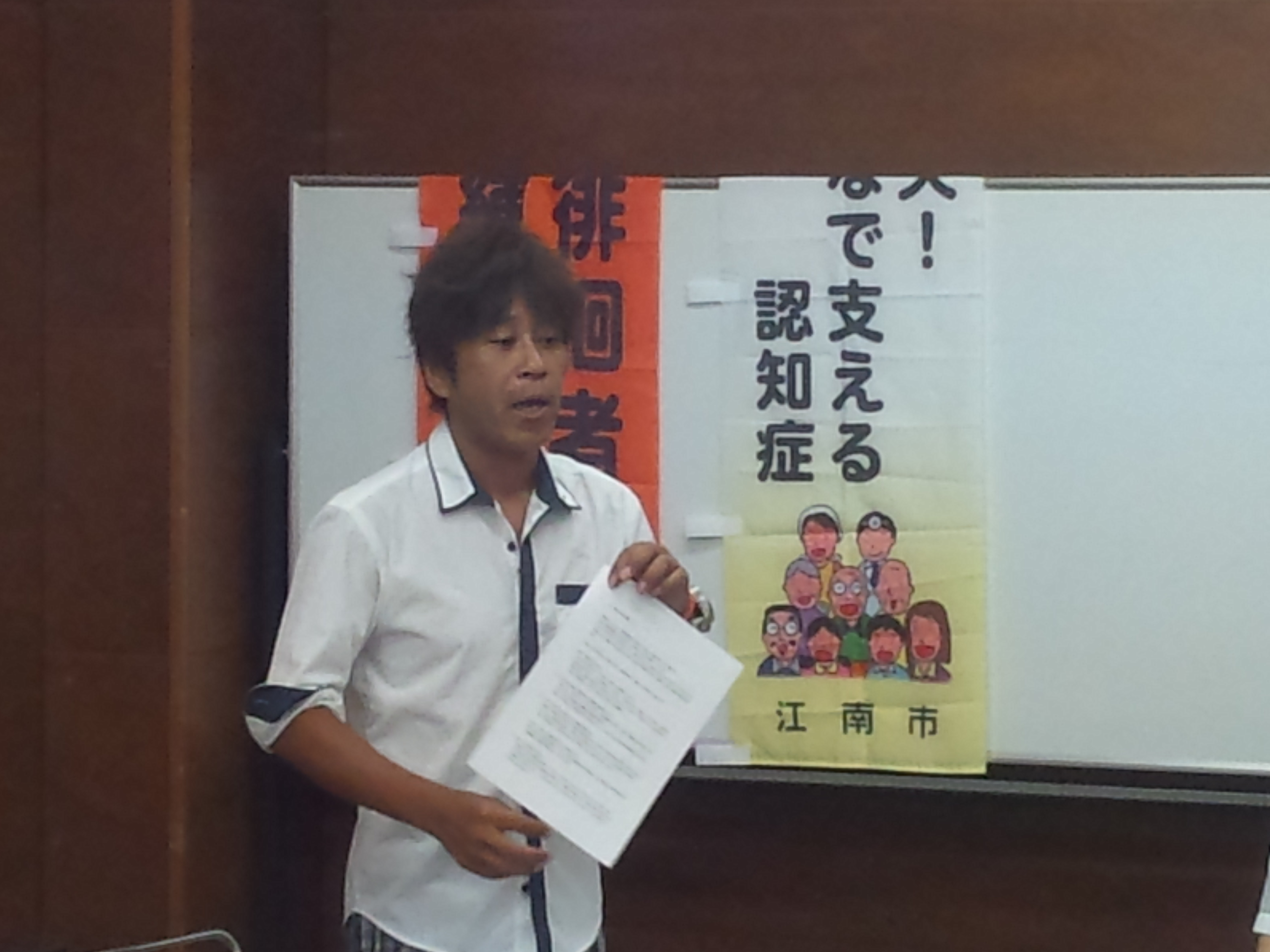 声かけ訓練の講師として、株式会社「波の女」(NHKのプロフェッショナル仕事の流儀で取り上げられました)で認知症の方を介護する事業所の施設長である、井さんより認知症の方への声かけで大切なことをお話いただきました。