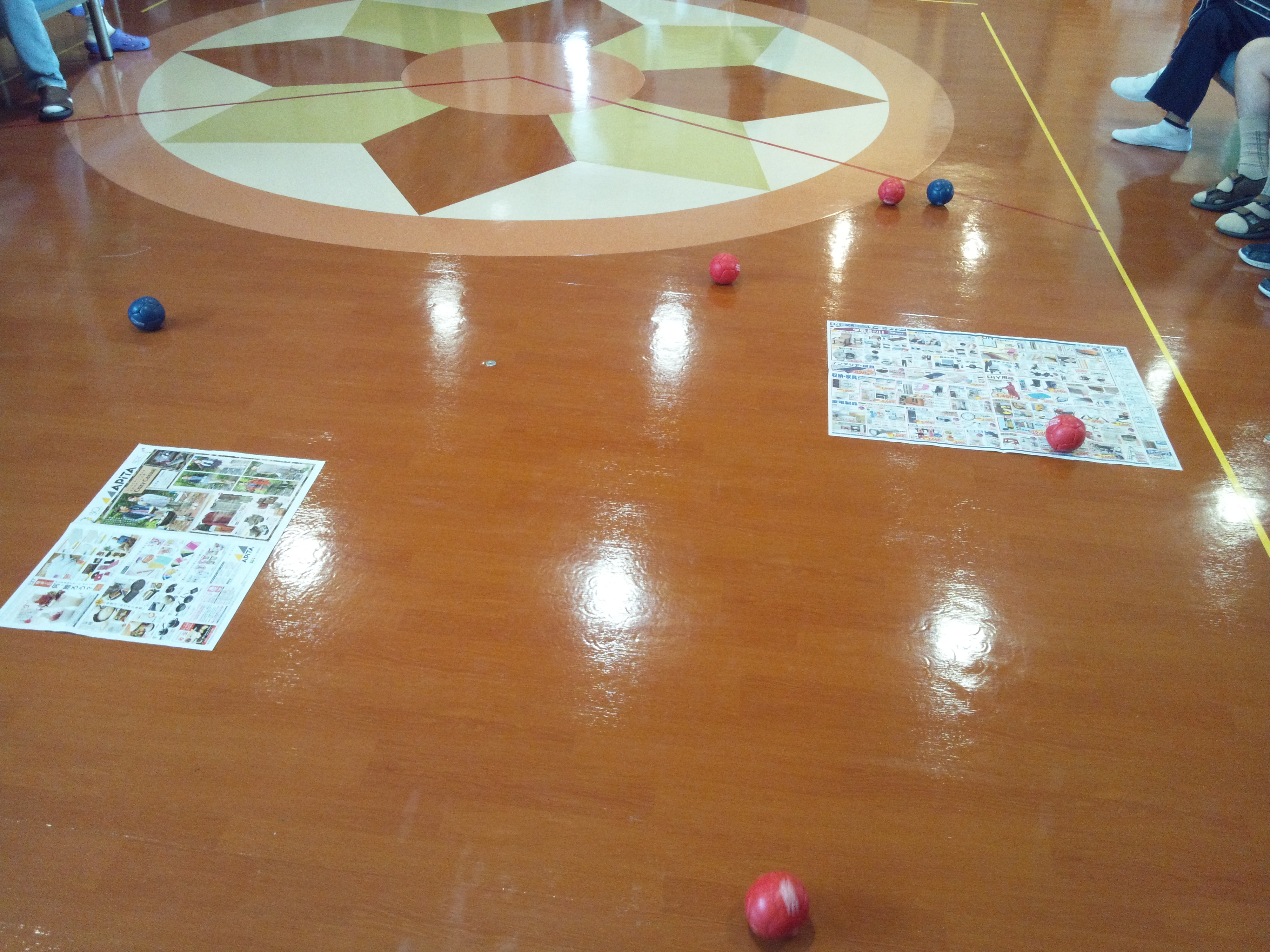 コート上に新聞や広告チラシを置いて、利用者の方々に「単に投げる」だけでなく「目標も持って投げる」を意識して行う練習です。