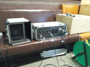 この磁気誘導ループは携帯型(移動式)です。磁気を発生させるアンプから、磁器を発生させるワイヤーにつないで、磁界を作ります。