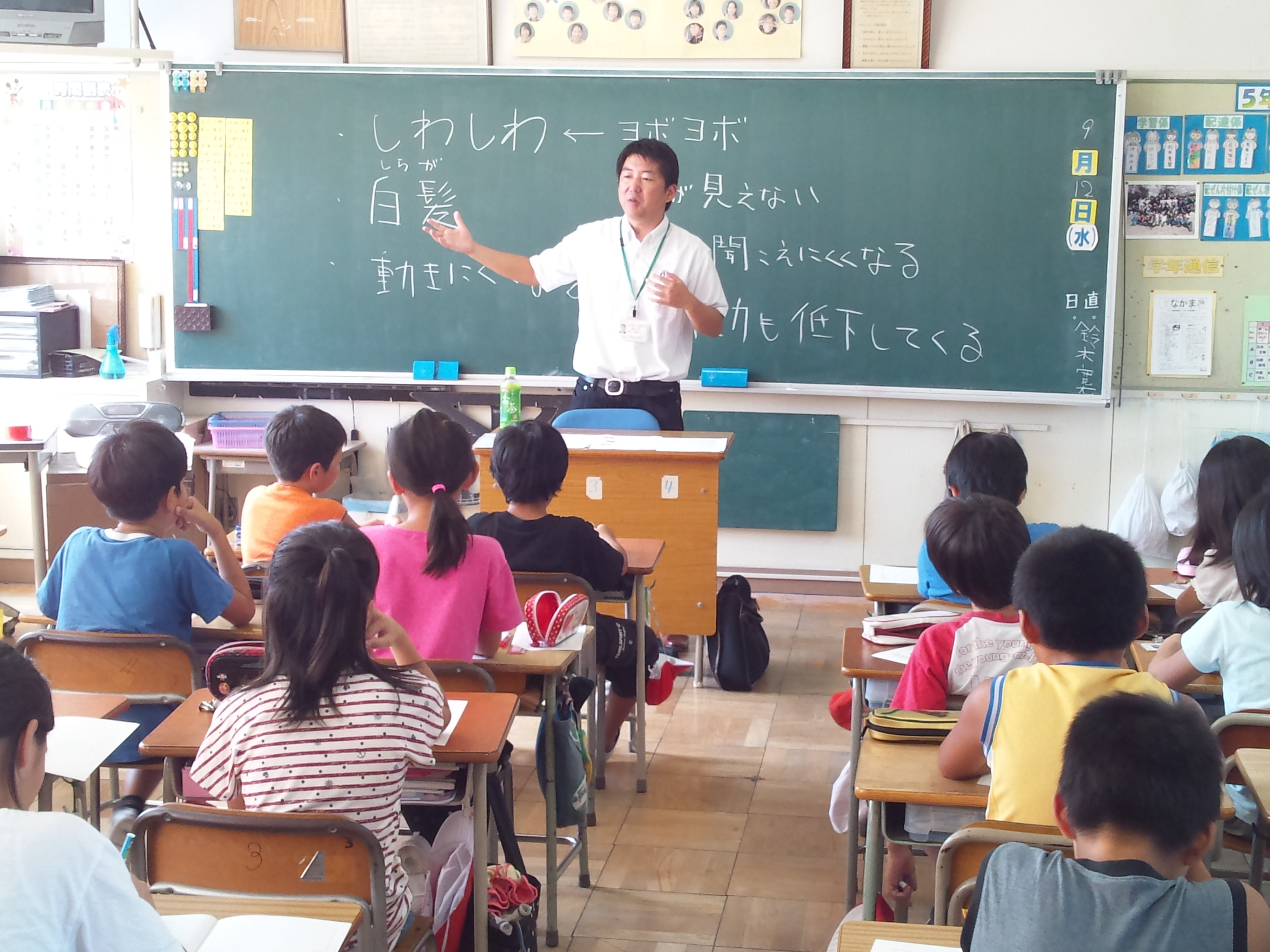 職員の方々はお話をしたり、子ども達に質問をしたりしながら、「元気なお年寄り」から「介護・認知症のお年寄り」までのイメージをわかりやすく伝えていただきました。