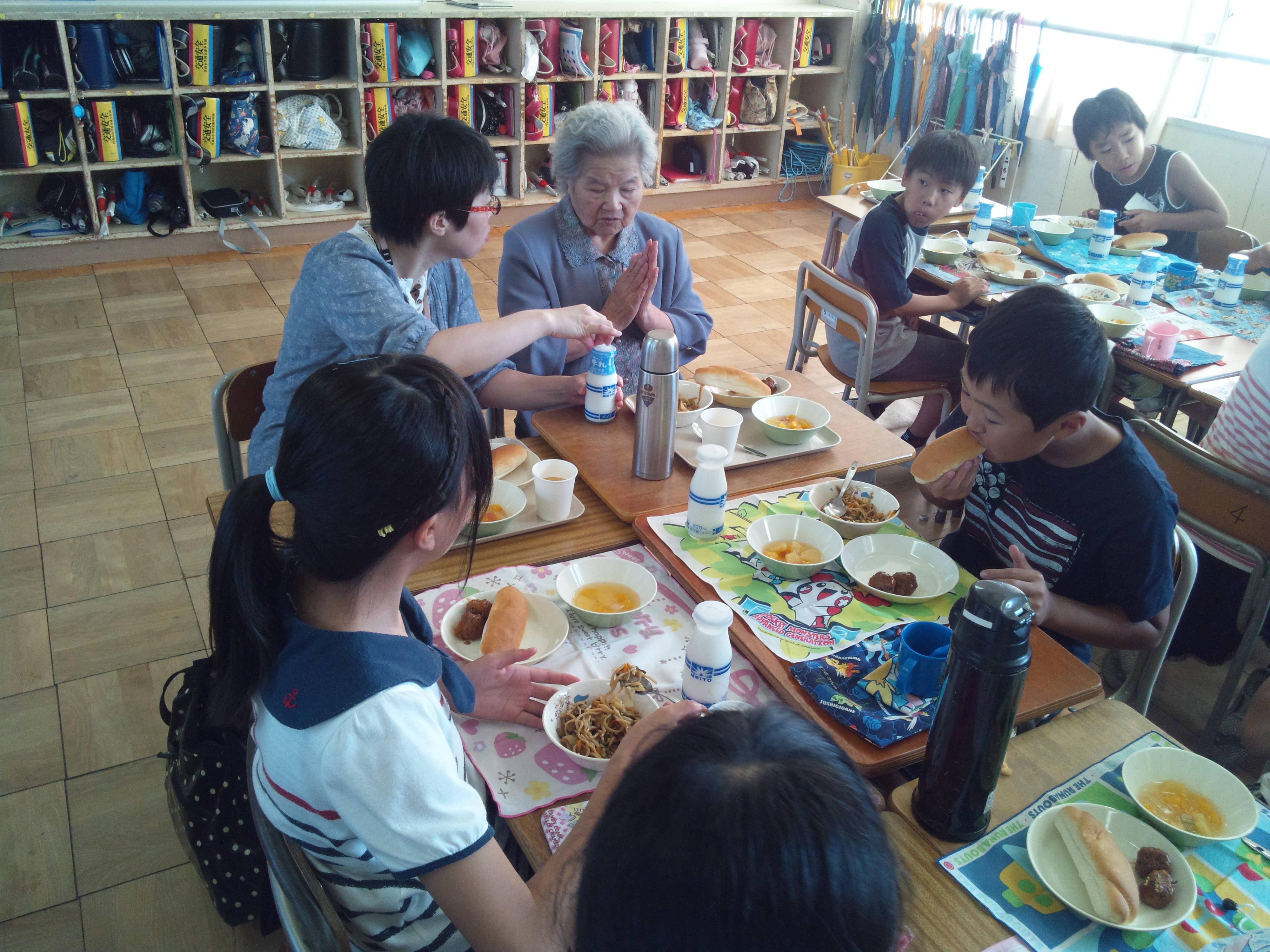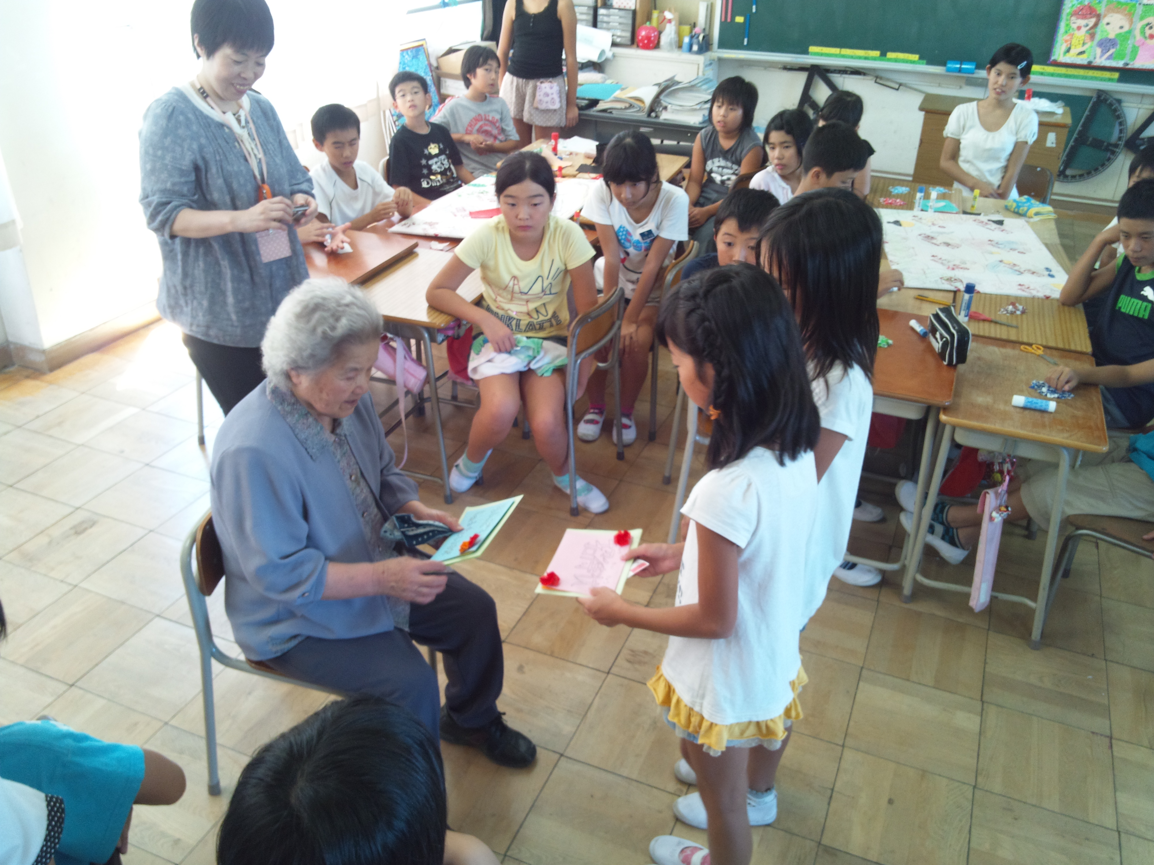 授業が終わって、ジョイフル江南の利用者の方々との交流を行いました。子ども達と給食を一緒に食べ、たくさんお話をしました。子ども達からの質問に「昔は給食なんてなかったのよ」「私はミシンの仕事をしてたのよ」「昔より今の方が全然いいわね」等々、教えていただきました。