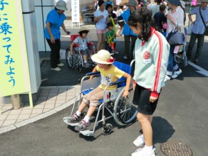 子ども達は車いすを自分で操作しながら、平坦なところも実はちょっとした上り坂だったり、道路が傾いてて思うように進まなかったり、悪戦苦闘していましたが、ボランティアスタッフやお母さんやお父さんに見守られながら最後には上手に操作をしていました。