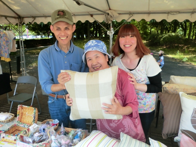 ふじの木園のブースです。いつもボッチャ(障がい者スポーツ)を一緒に行っています。今日はクッションを買いましたが、300円という激安で品質最高、小さいのはなんと100円!、衝動買いをしてしまいました(笑)。