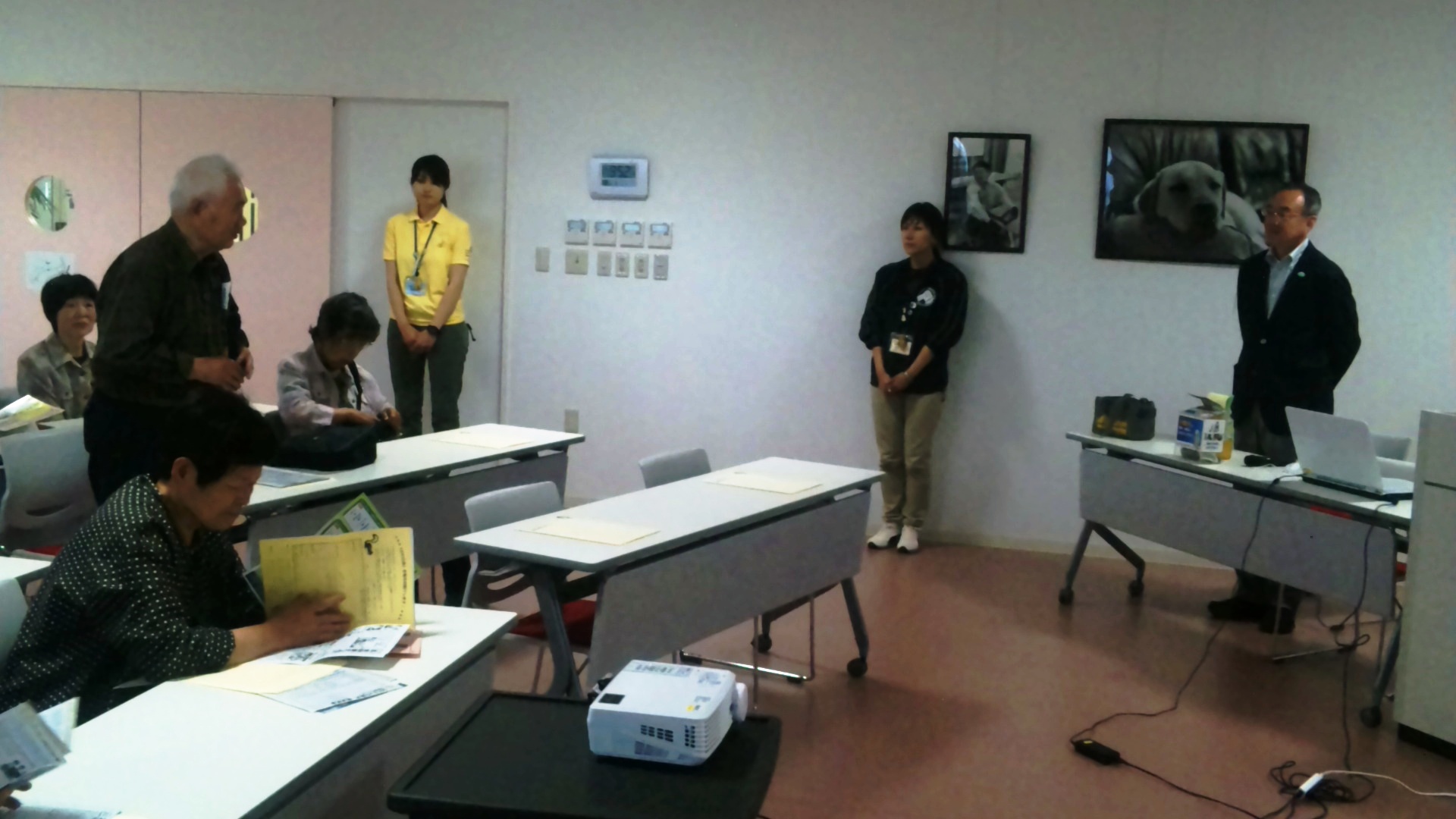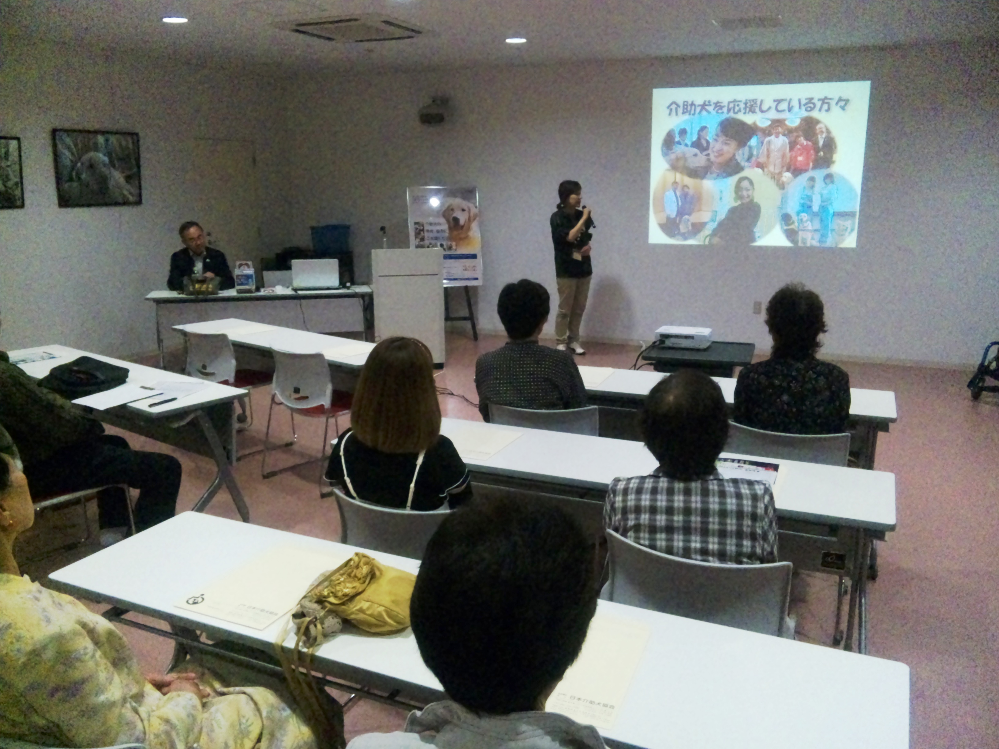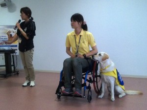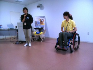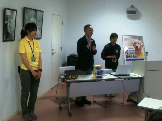 DVD試聴後、センター長の森田さんから、介助犬センターができるまでの経緯や2002年に制定された「身体障害者補助犬法」について等、わかりやすくご説明いただきました。5月22日のスカイツリーの式典に補助犬(盲導犬・聴導犬・介助犬)ユーザーが参加したことのお話も聞くことができました。