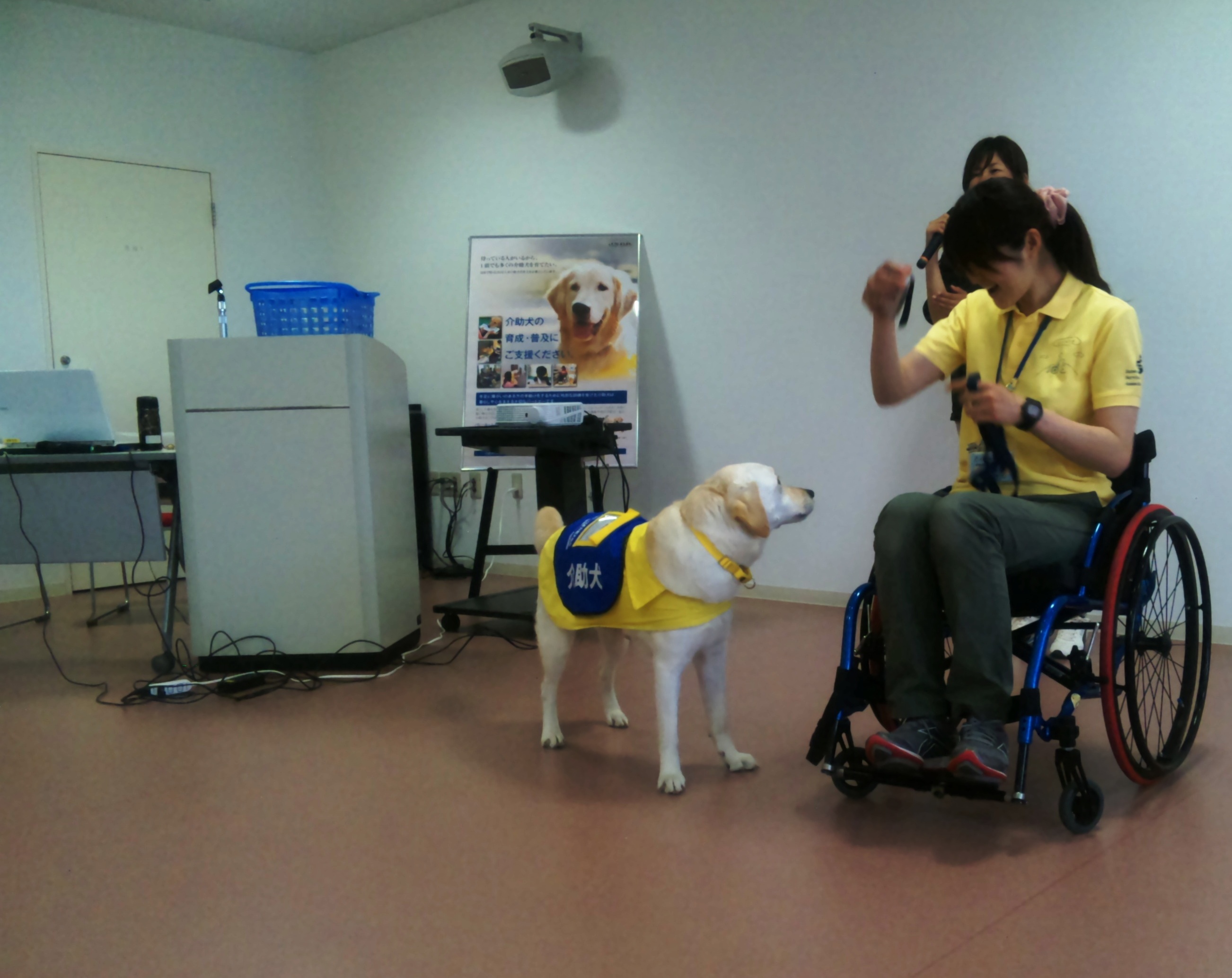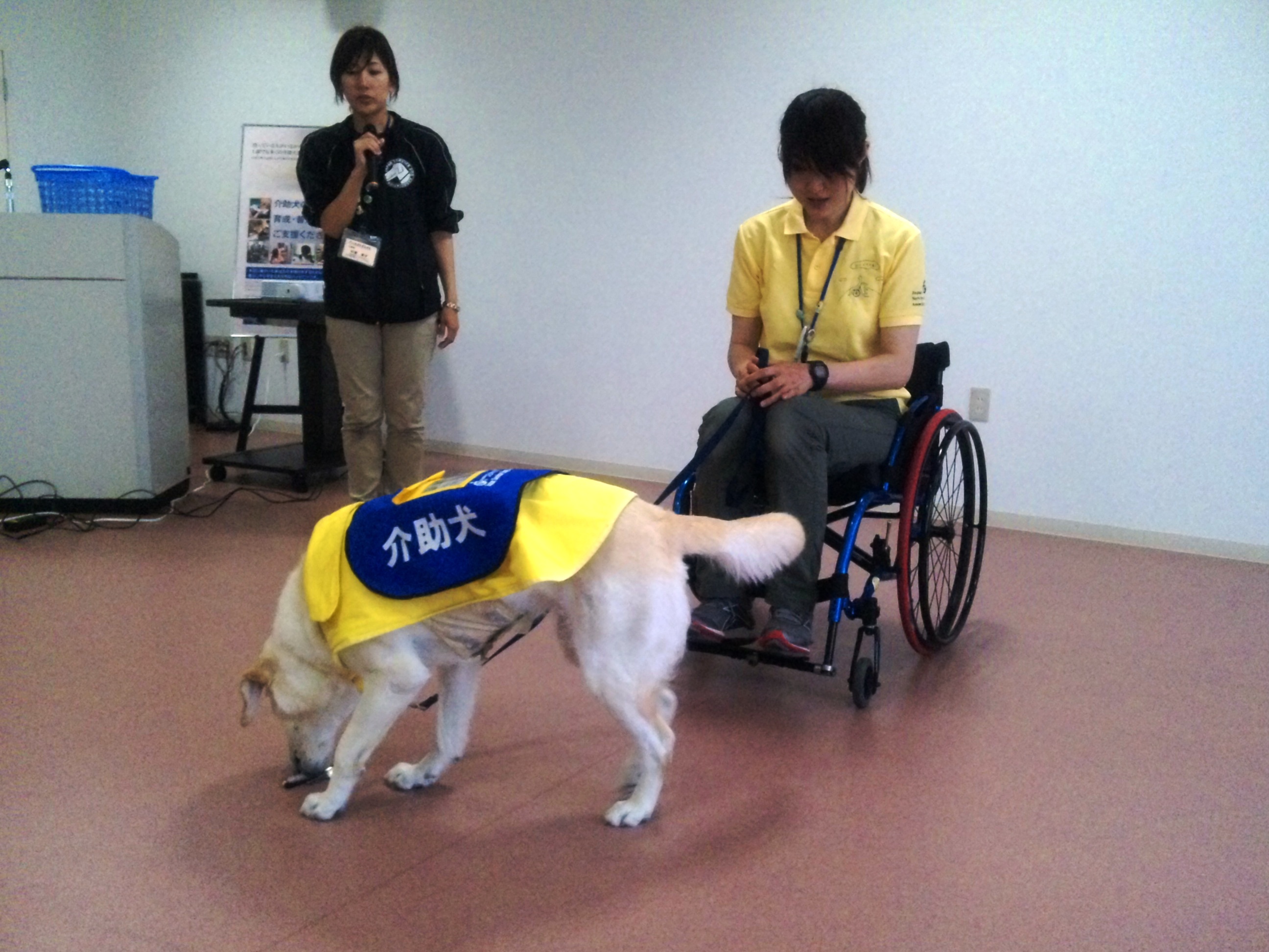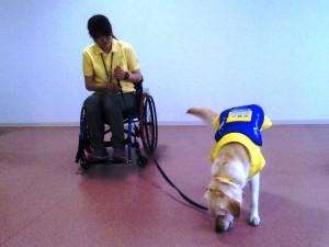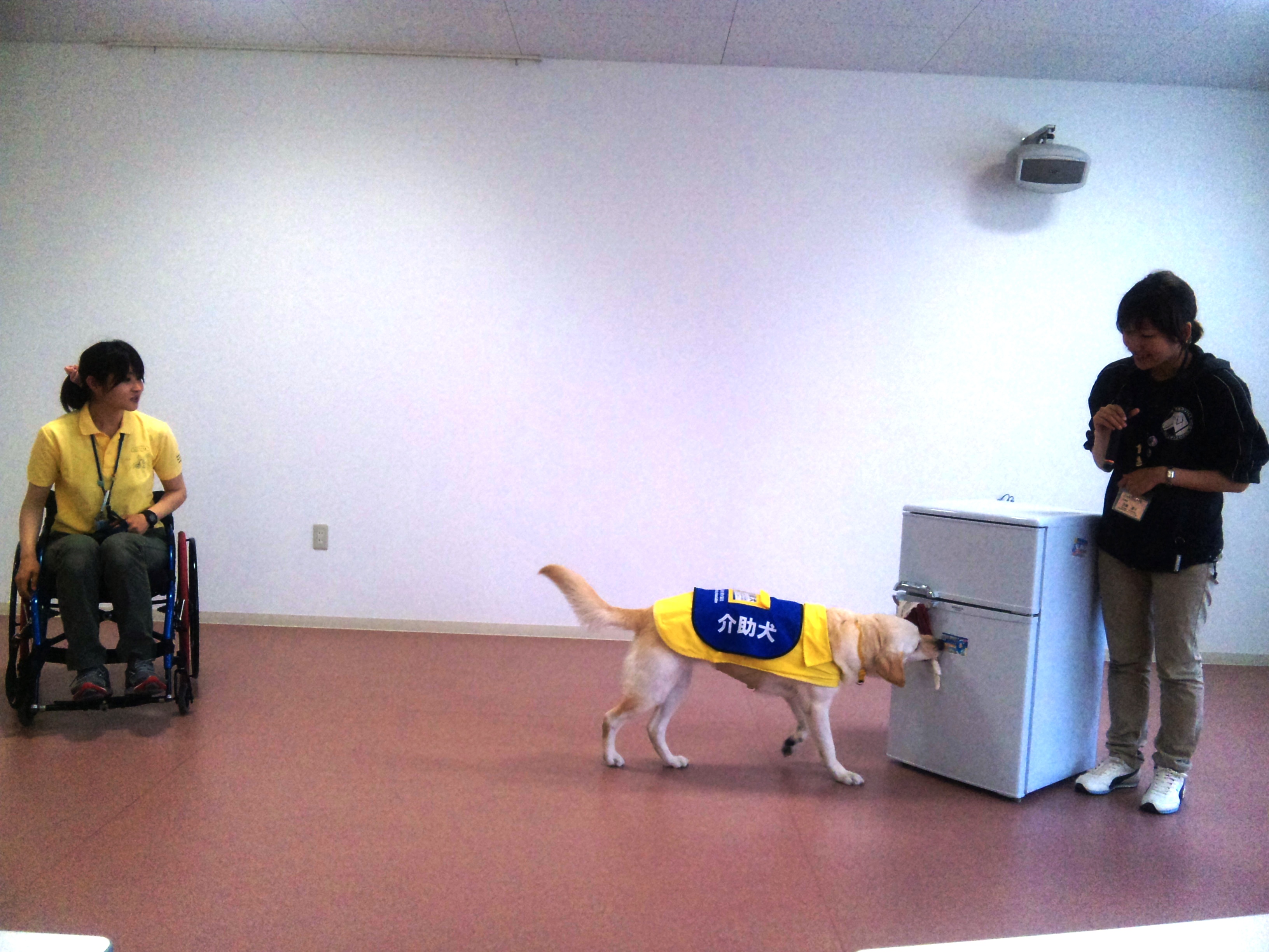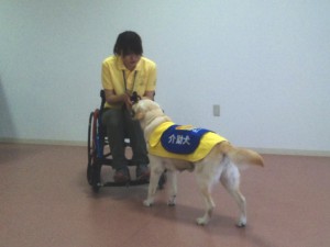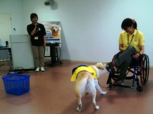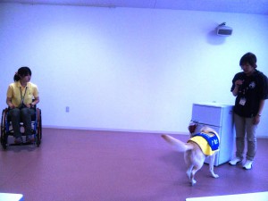 最初は落ちたペンを拾って、ユーザーに渡すところから始まりました。できたときは拍手をしてみんなで褒めました。褒めることで介助犬は喜びを感じて、ひとつひとつの介助内容を覚えていくとのこと。