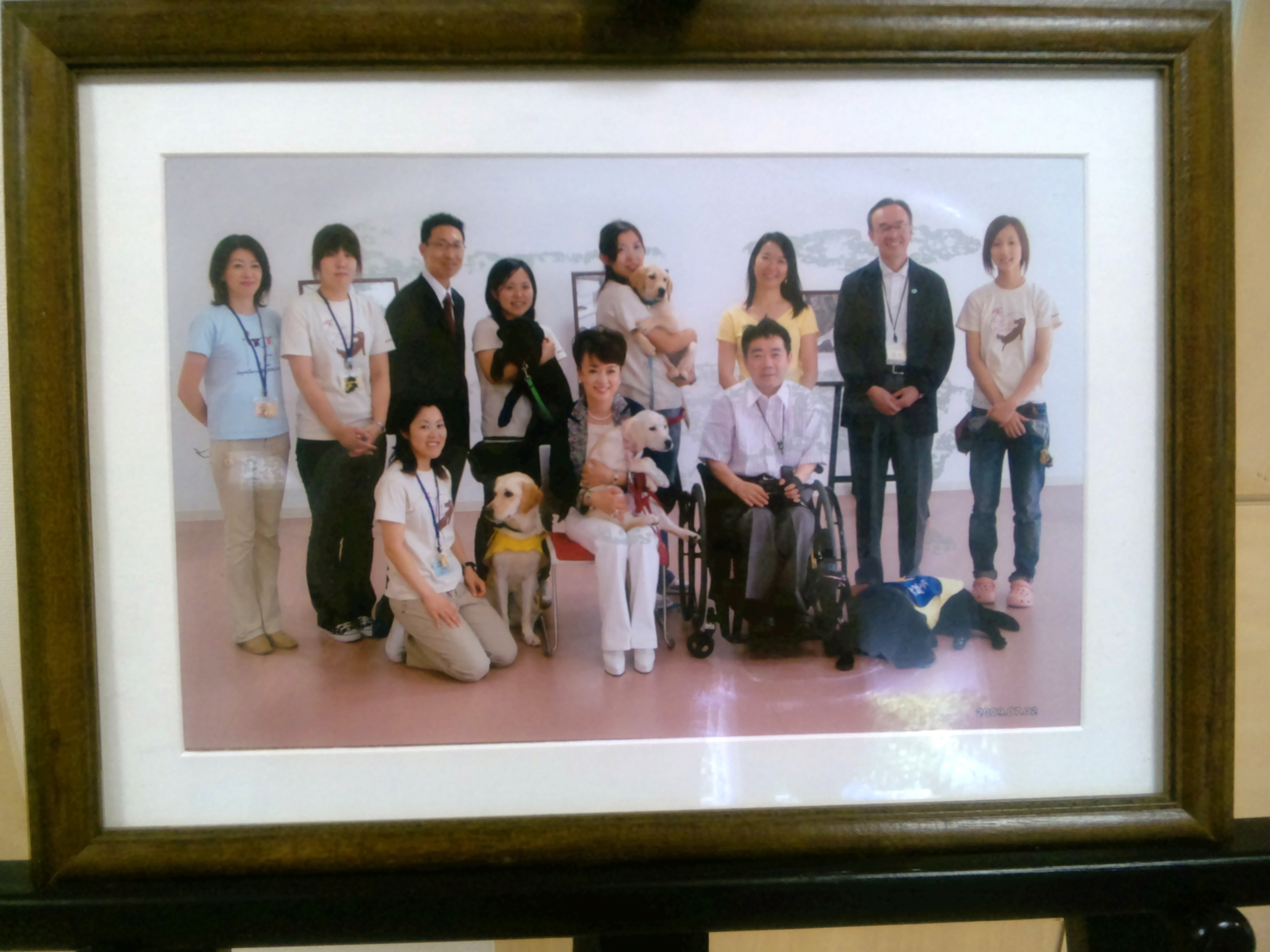 館内にあった写真です。職員の方々やユーザーの方、そしてジュディオングさんが介助犬の支援に尽力されているお話を伺うことができました。